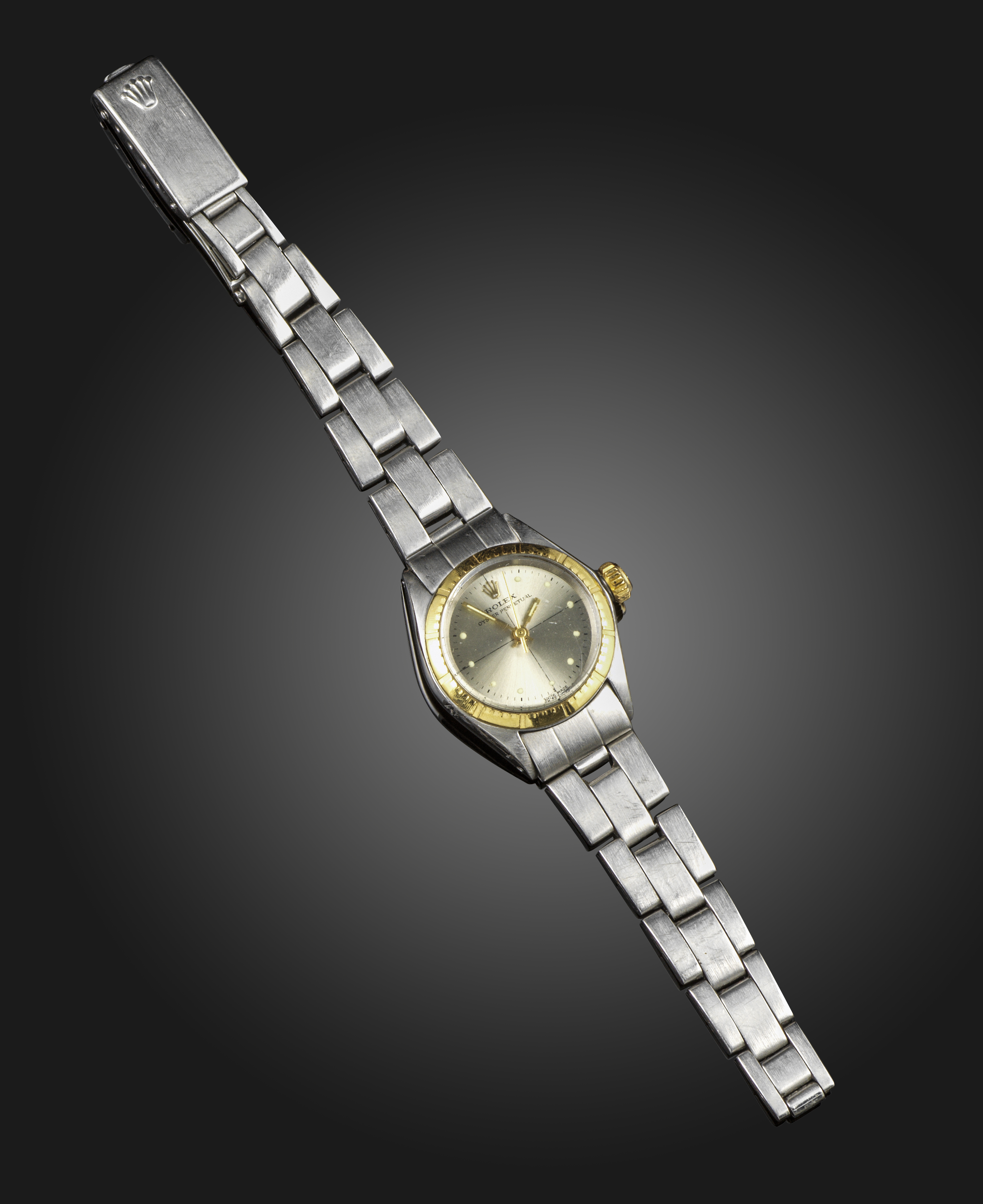 A lady's Oyster Perpetual wristwatch by Rolex, the signed dial with gold bezel on steel bracelet (broken) automatic movement, case 2.8cm wide