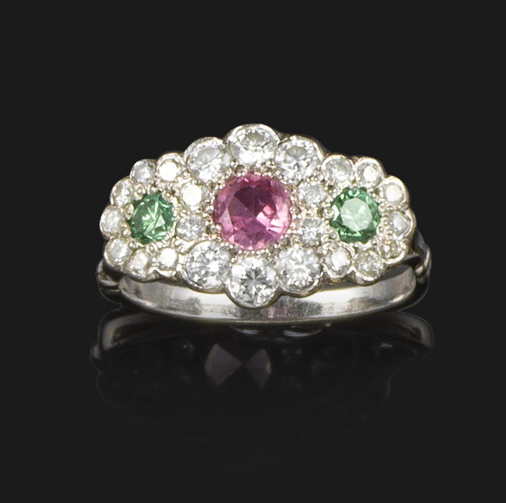 A pink sapphire, coloured and white diamond set triple cluster ring, the centre cluster with a pink sapphire, the shoulder clusters with a smaller green coloured diamond, in platinum. Size M 1/2