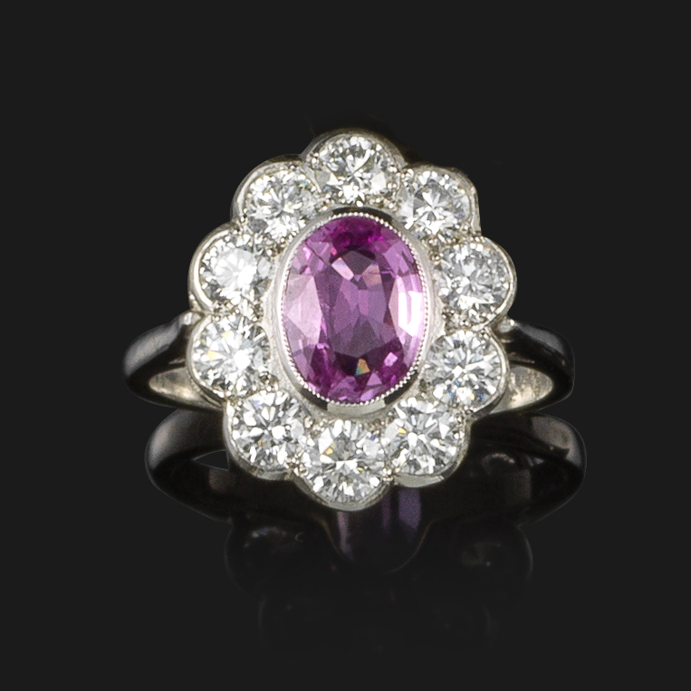 A pink sapphire and diamond cluster ring, the oval-shaped pink sapphire is set within a surround of round brilliant-cut diamonds in platinum, size N