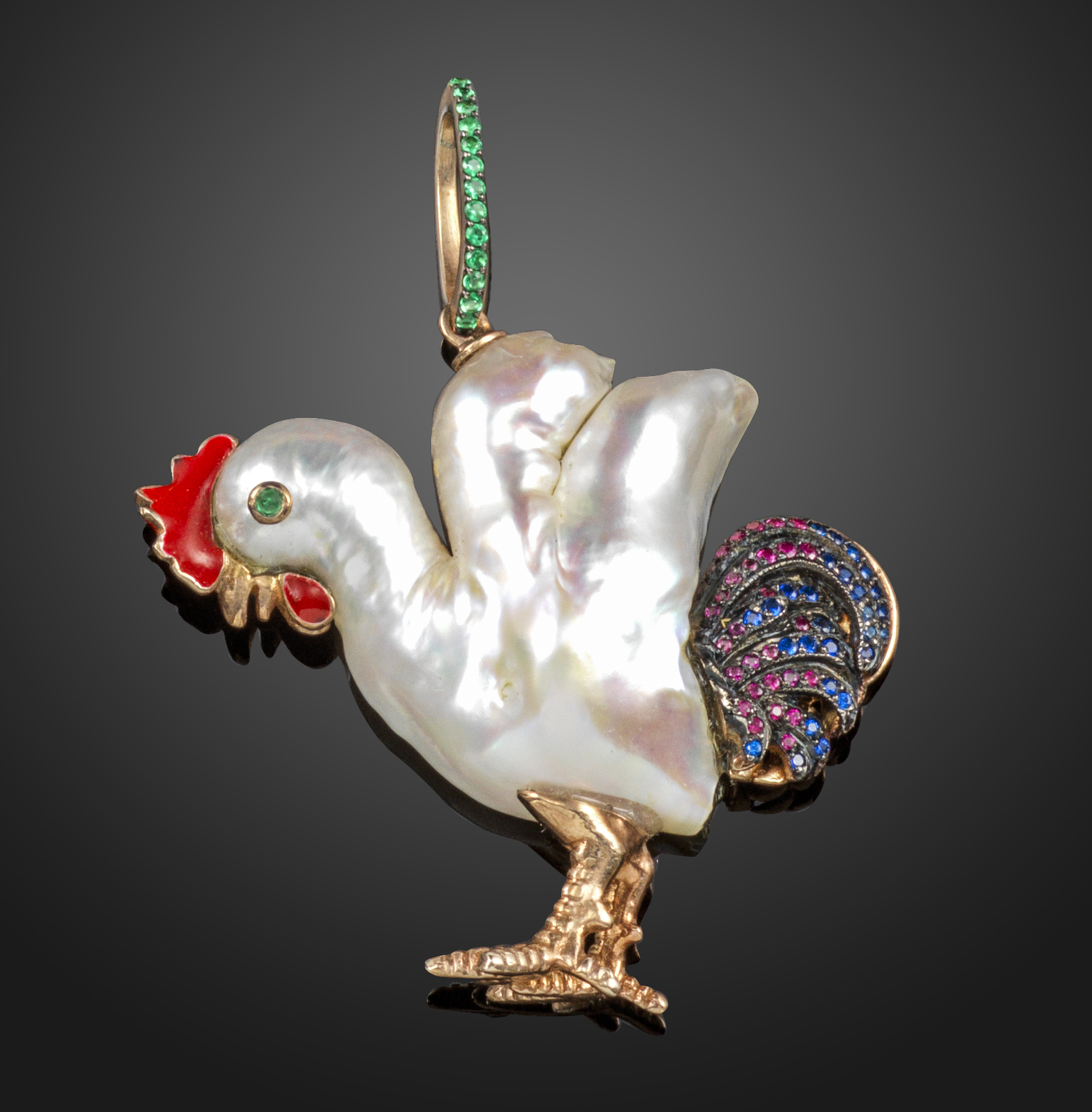 A paste-set cockerel pendant, the body formed from an unusually-shaped cultured pearl, with red enamel and silver-gilt beak and comb, the tail set with red and blue paste stones, with silver gilt mounts, 4.5cm wide, case