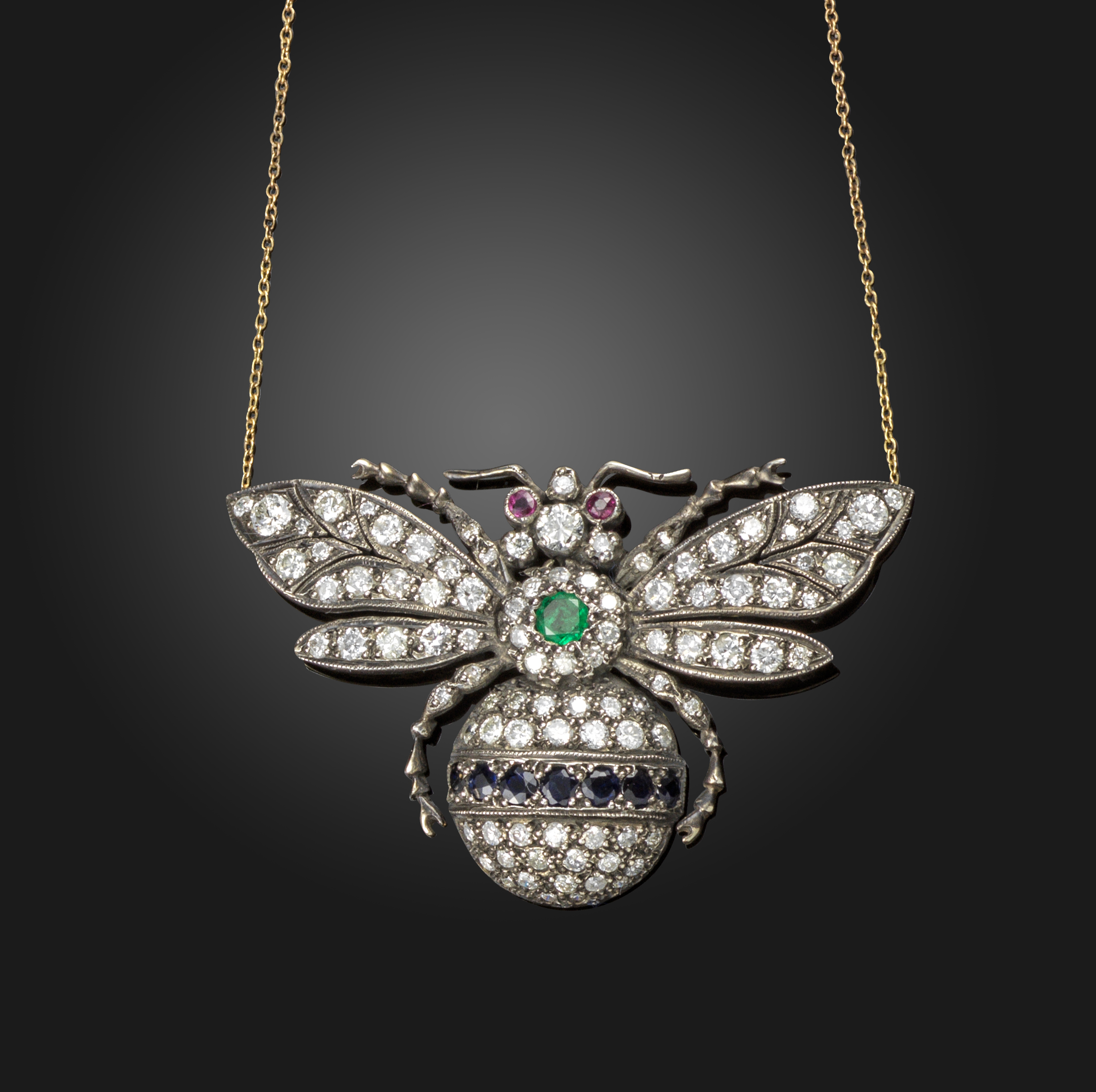 A diamond and gem-set bee pendant, pave-set overall with graduated circular-cut diamonds and a further line of sapphires, an emerald and ruby eyes, set in silver and gold, 5.3cm wide, suspended from a fine-link yellow gold necklace, 45cm long