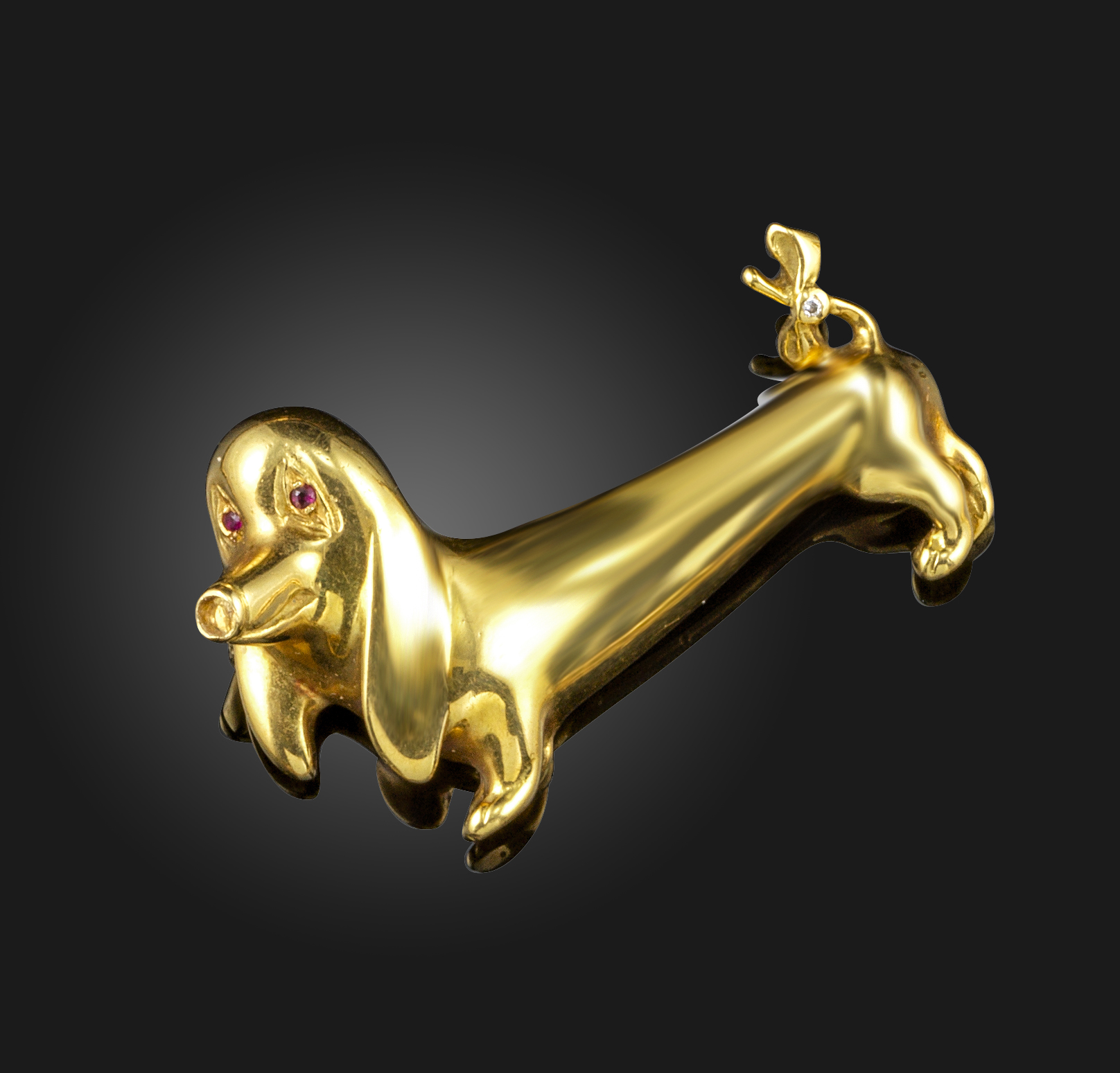 A gold Dachshund brooch, the stylised dog with ruby eyes and a diamond-set tail in yellow gold, 4.5cm wide