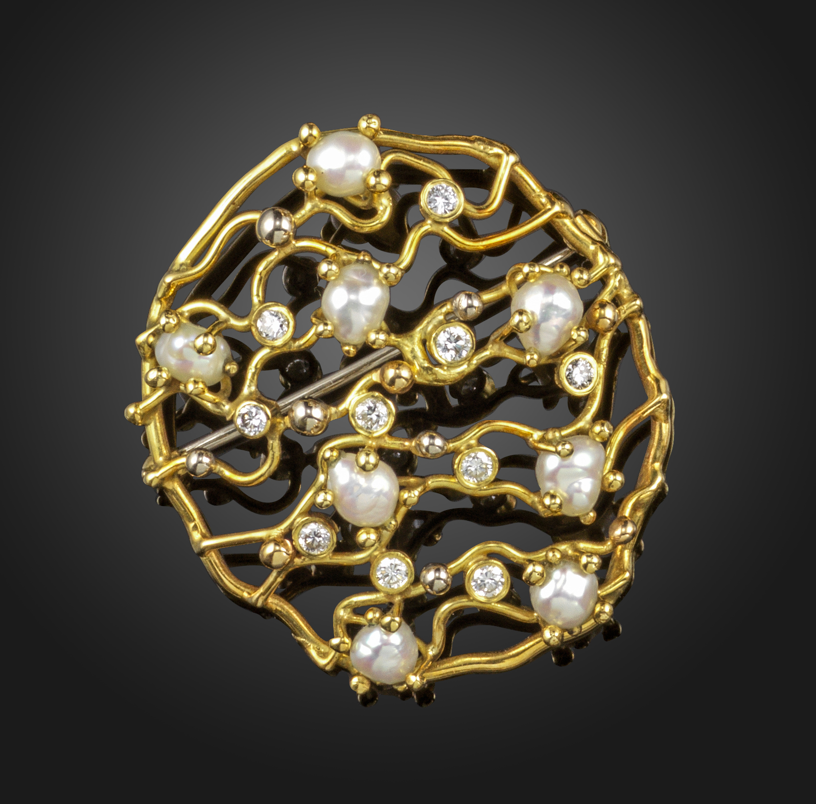 An 18ct gold tendril form open brooch by Martin White, set overall with cultured pearls and circular-cut diamonds, maker's mark and London marks for 1991, 3.7cm wide, case