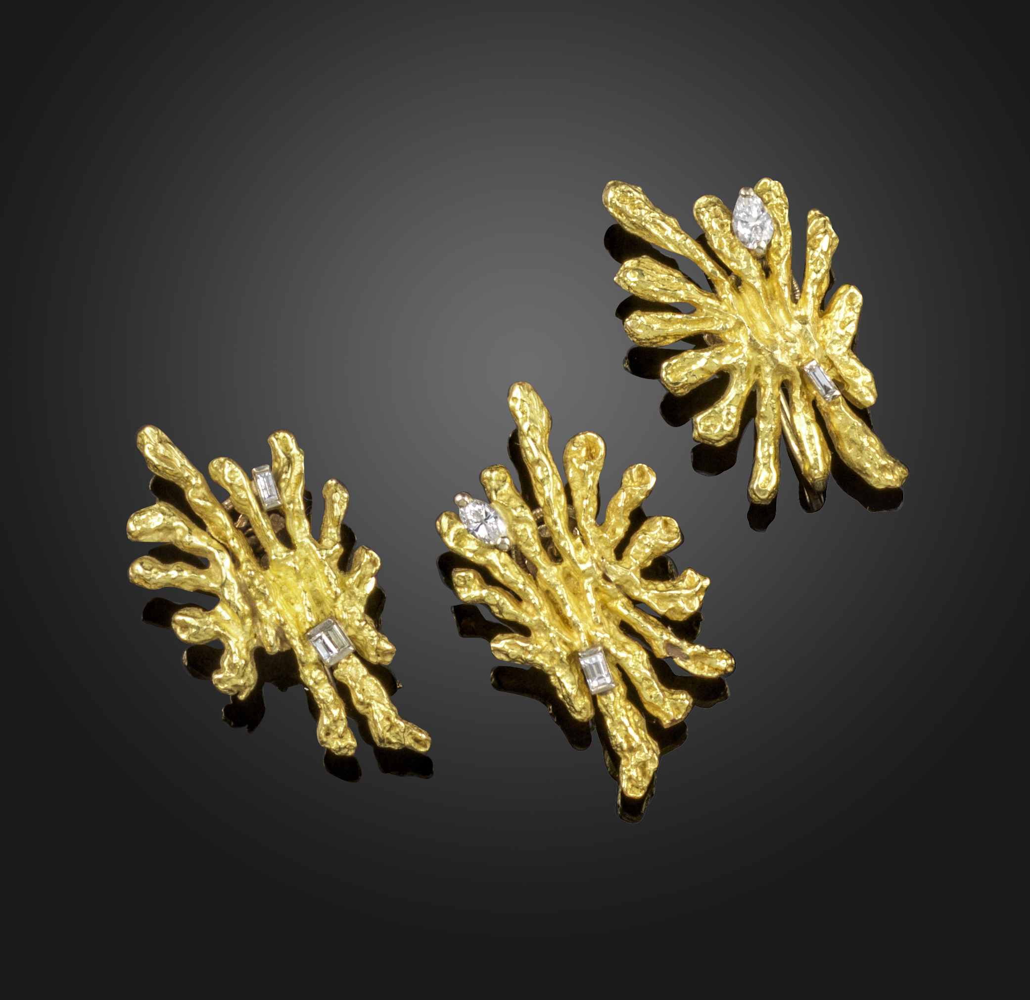 A set of textured gold and diamond-set earrings