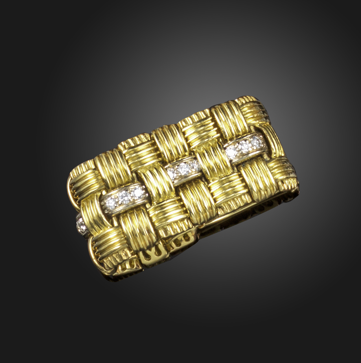 A yellow gold flexible lattice-work ring, alternate links each set with three round brilliant-cut diamonds and set with a marquise-shaped ruby to the interior in the style of Roberto Coin, size M (approximately)