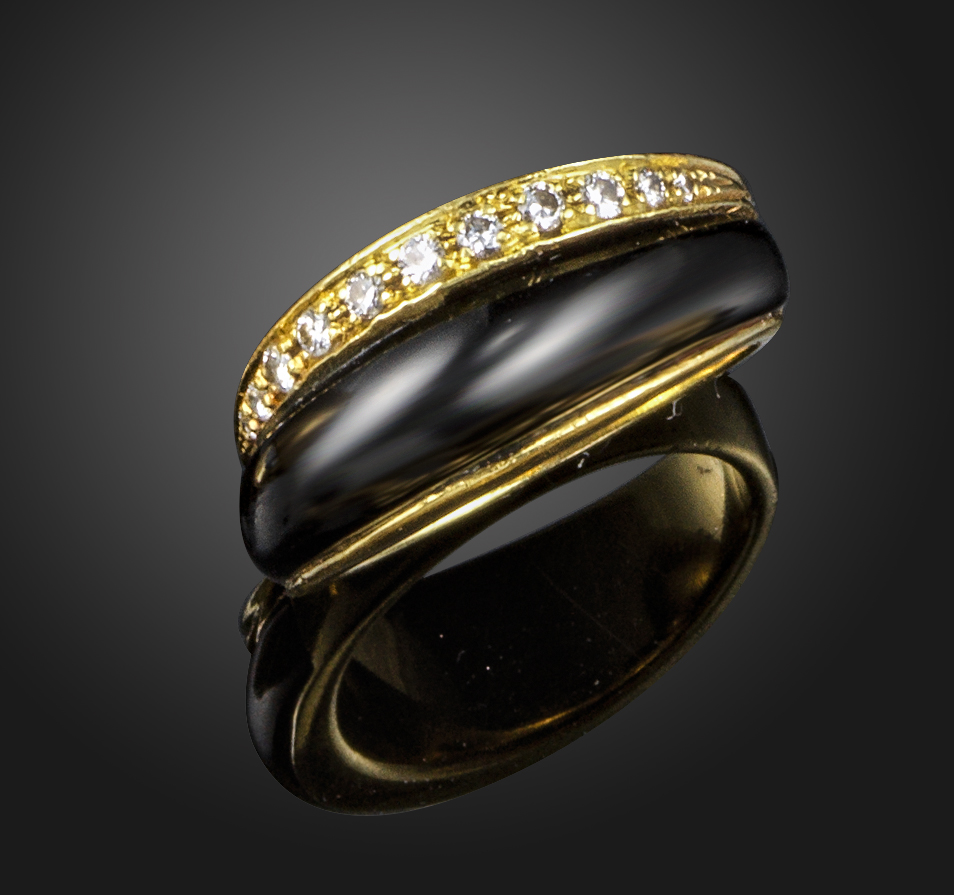 An onyx and diamond ring, set with graduated round brilliant-cut diamonds and carved onyx in yellow gold, initials LJM, 18ct Sheffield import marks for 1979, size R