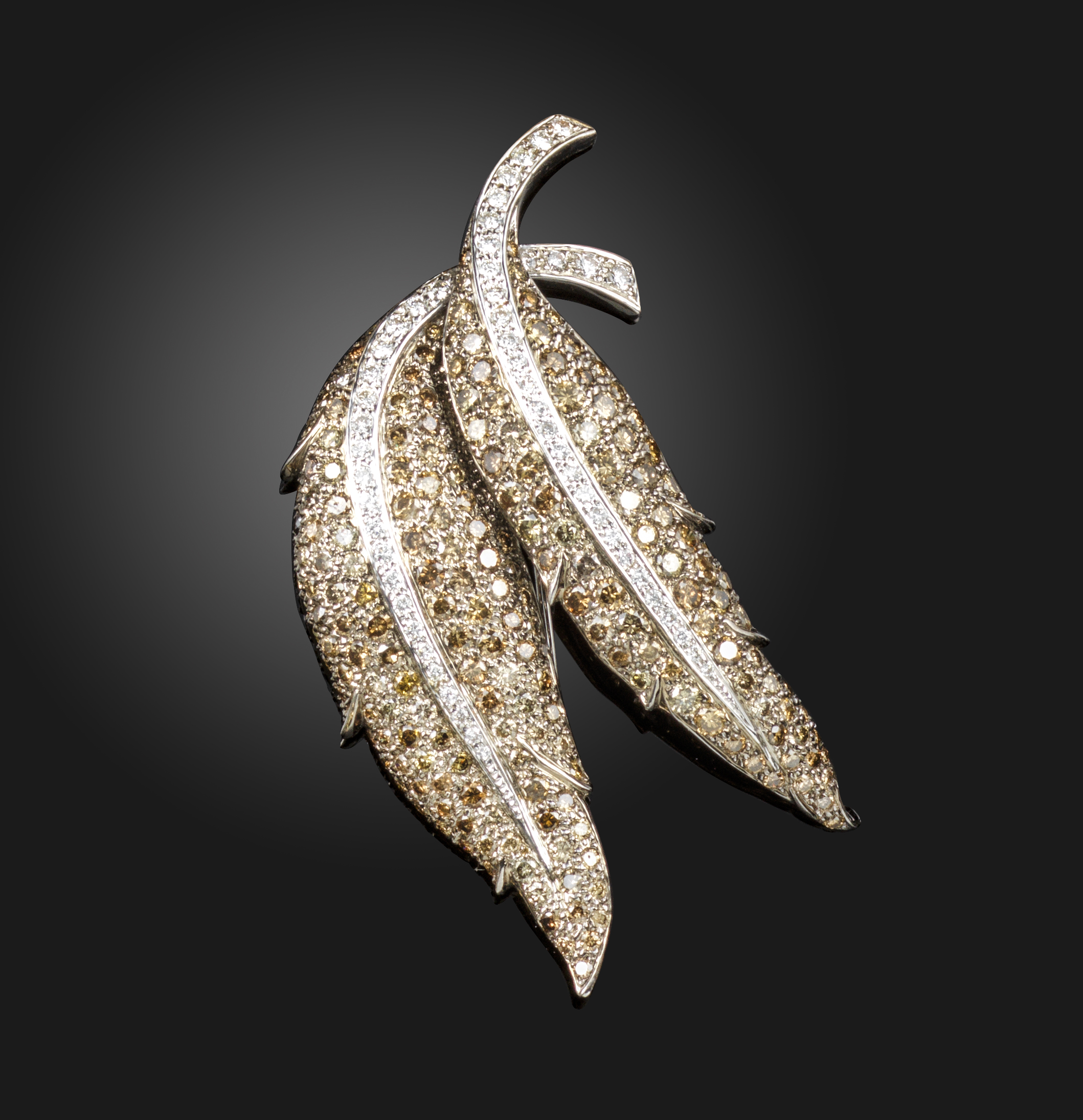 A fancy-coloured diamond-set leaf brooch, pavé-set with fancy-coloured and colourless diamonds in white gold, 7cm high