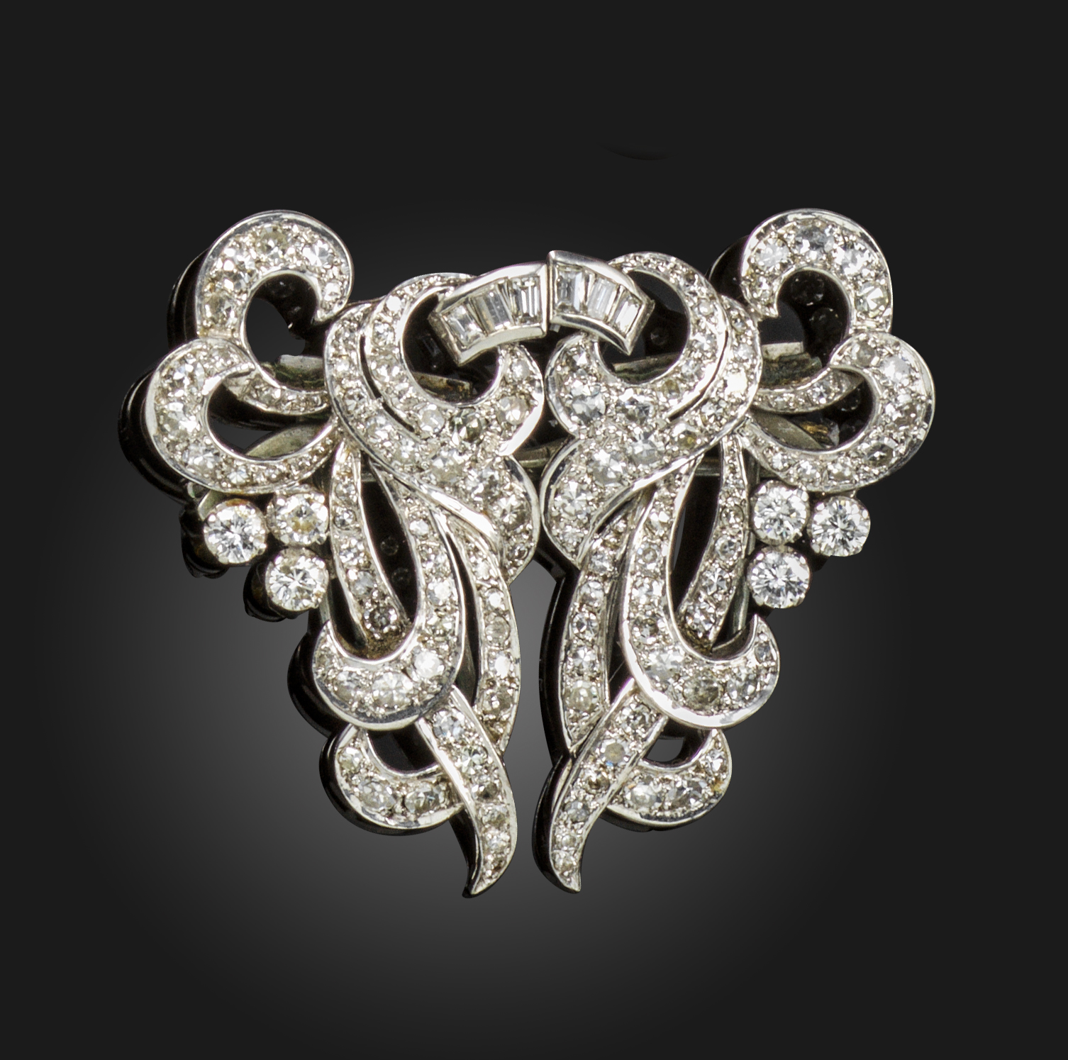 A diamond double clip scroll brooch, set overall with graduated circular and baguette-shaped diamonds in platinum, the two scroll clips detach from the brooch fitting to be worn as double clips, 4.4cm wide
