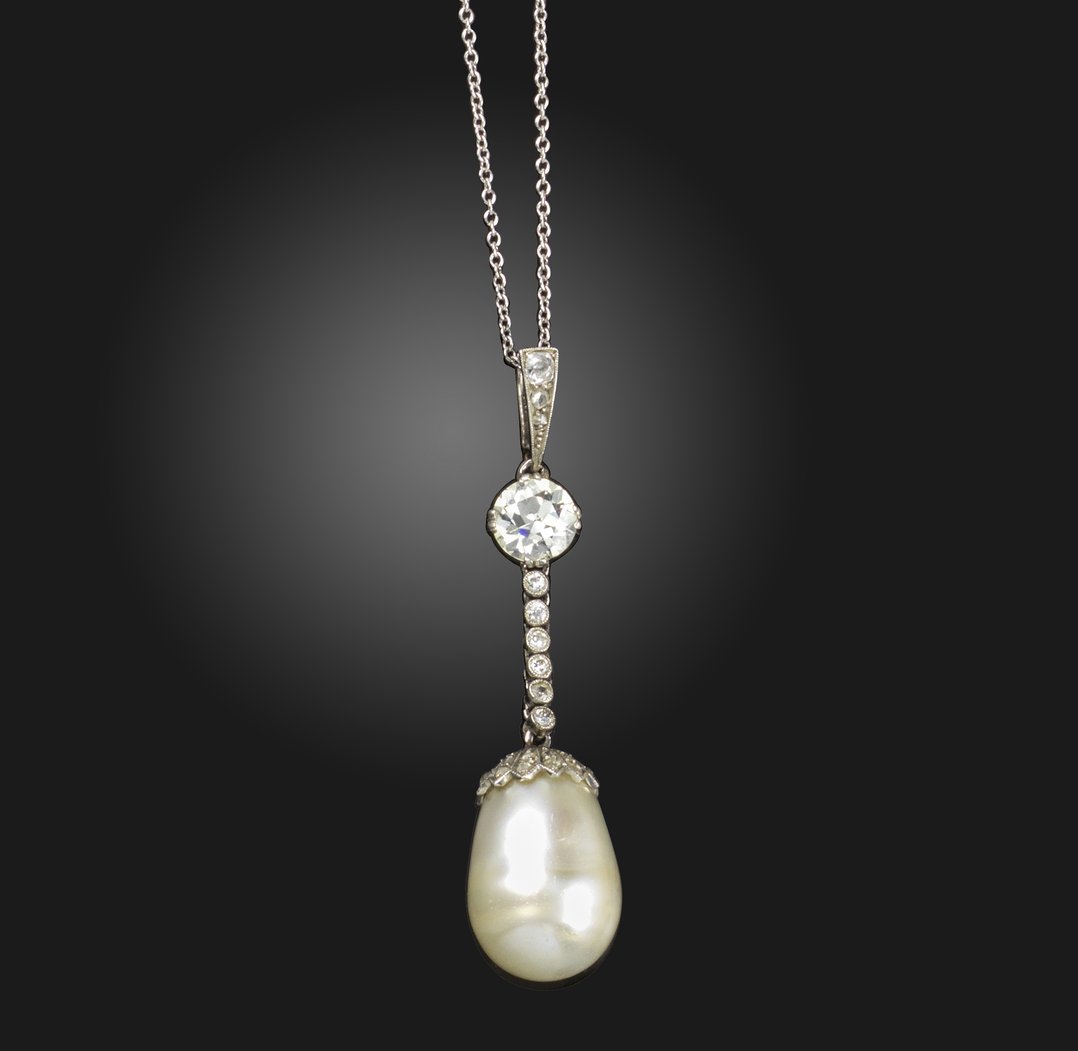 A natural pearl and diamond pendant, the old circular-cut diamond weighs approximately 0.95cts, suspends an articulated line of old circular-cut diamonds and a natural pearl with a rose-cut diamond-set cap in platinum, on a fine-link platinum neck chain, pendant 4.8cm high, chain 41cm long