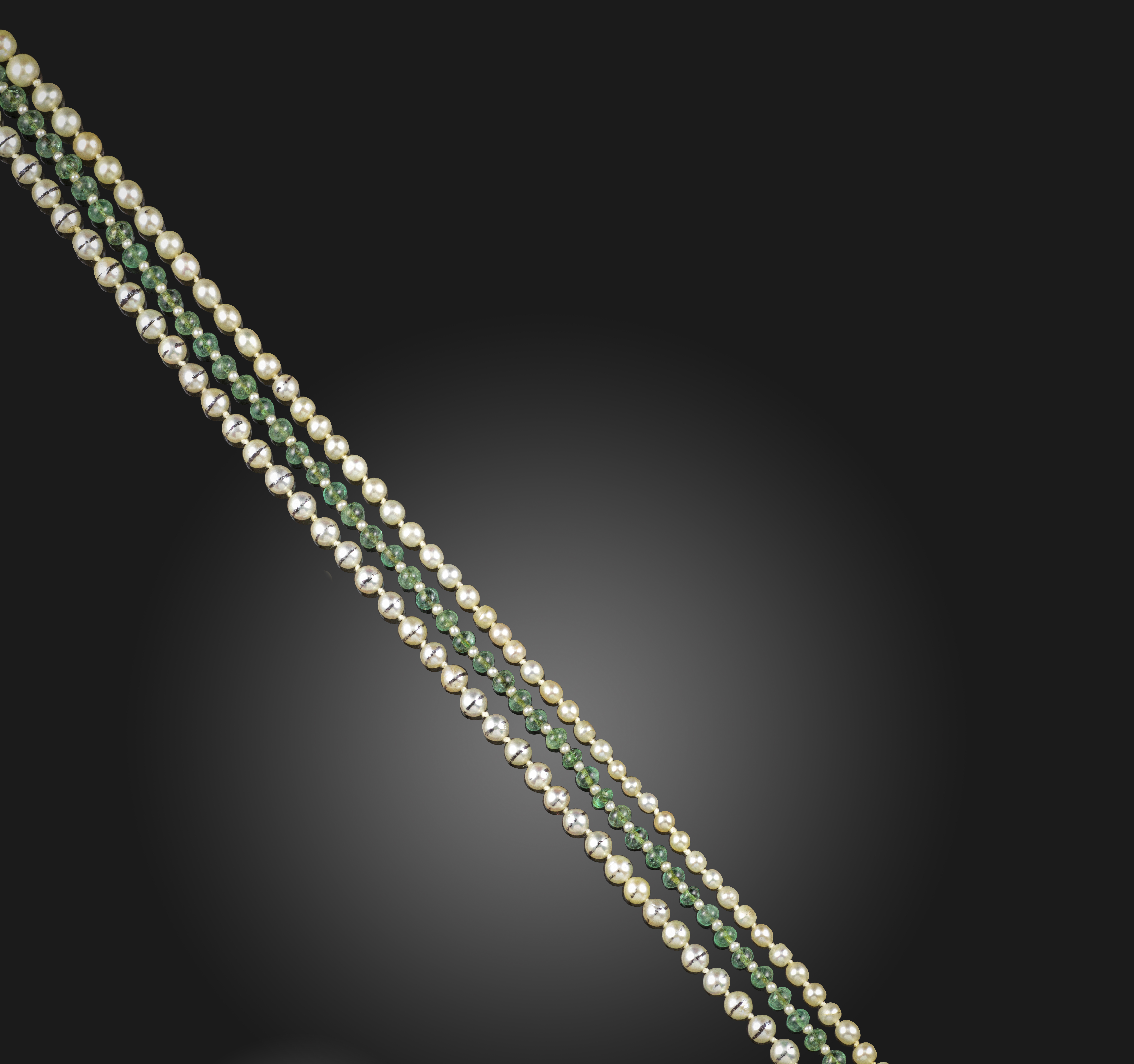 A three-row pearl and emerald necklace, set with two rows of graduated pearls and a single row of emerald beads alternately-set with seed pearls, with a rose-cut diamond, emerald and seed pearl flower head clasp, 49cm longest