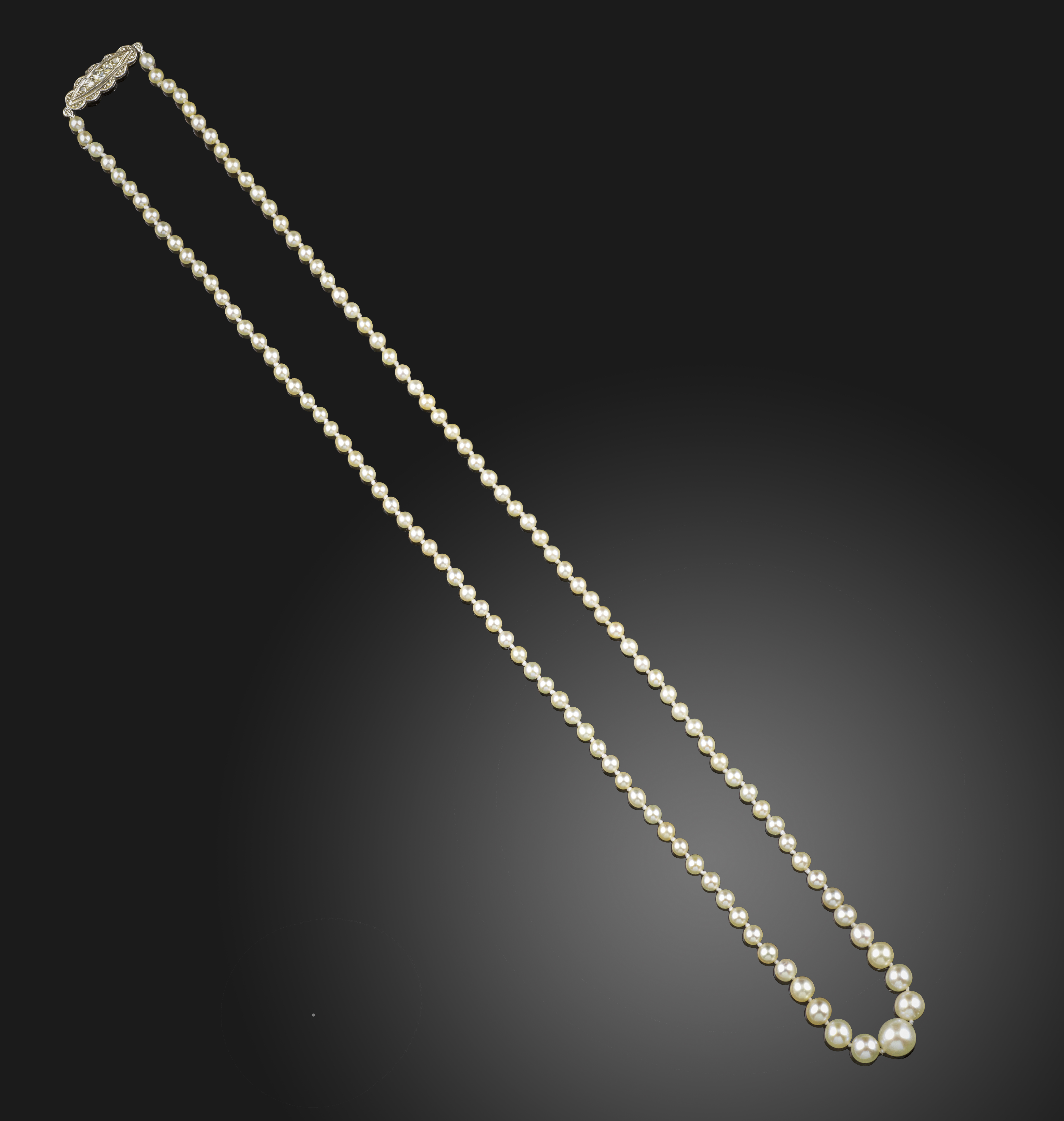 A single-row natural pearl necklace, the pearls graduate from 2.6 - 6.8 with a diamond set lozenge clasp, in white gold, 48cm long