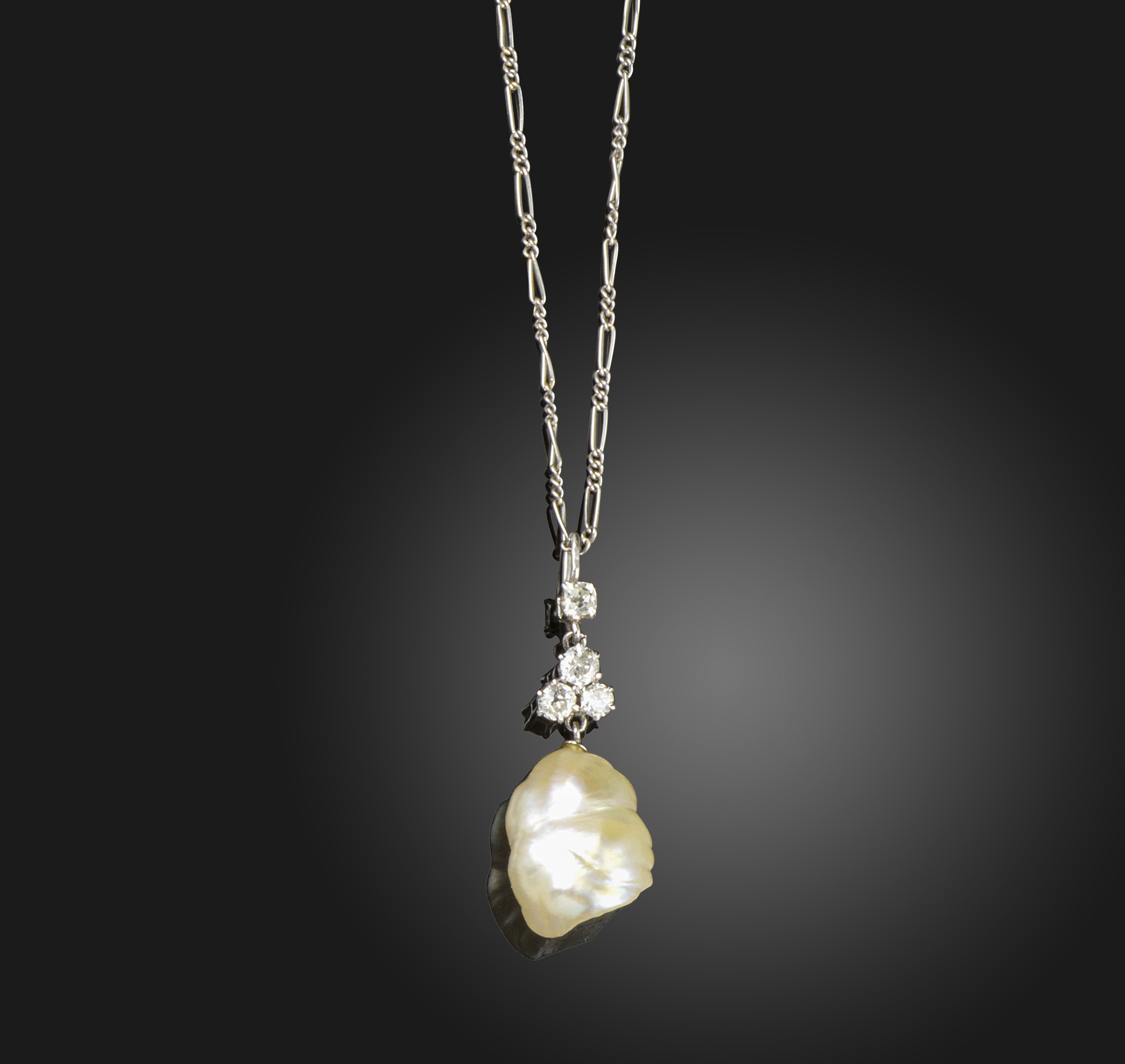 A natural pearl and diamond pendant, the baroque-shaped pearl suspends below a trefoil of circular-cut diamonds in white gold, with a further circular-cut diamond to the suspension loop, on a fine-link white hold neck chain, 3.2cm high, case