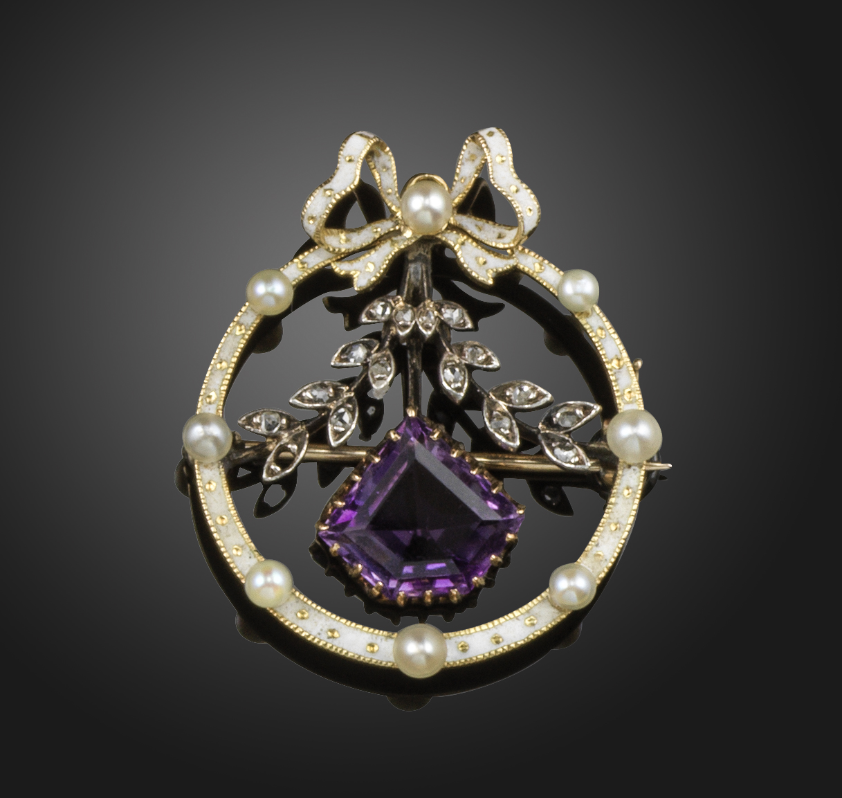 An Edwardian gem-set and enamel gold brooch pendant, with white enamel decoration on gold, set with seed pearls, suspending an amethyst on knife-edge link below a rose-cut diamond-set foliate section in silver on gold (one diamond missing), 3.2cm high, fitted case by Carrington & Co