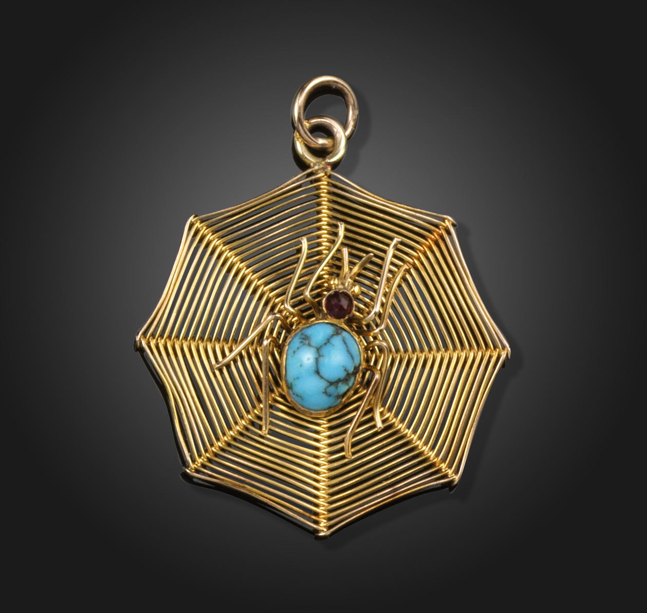 A gem-set spider web pendant, the gold spider's web set with a stylised spider set with turquoise matrix and a red stone in yellow gold, 3cm wide