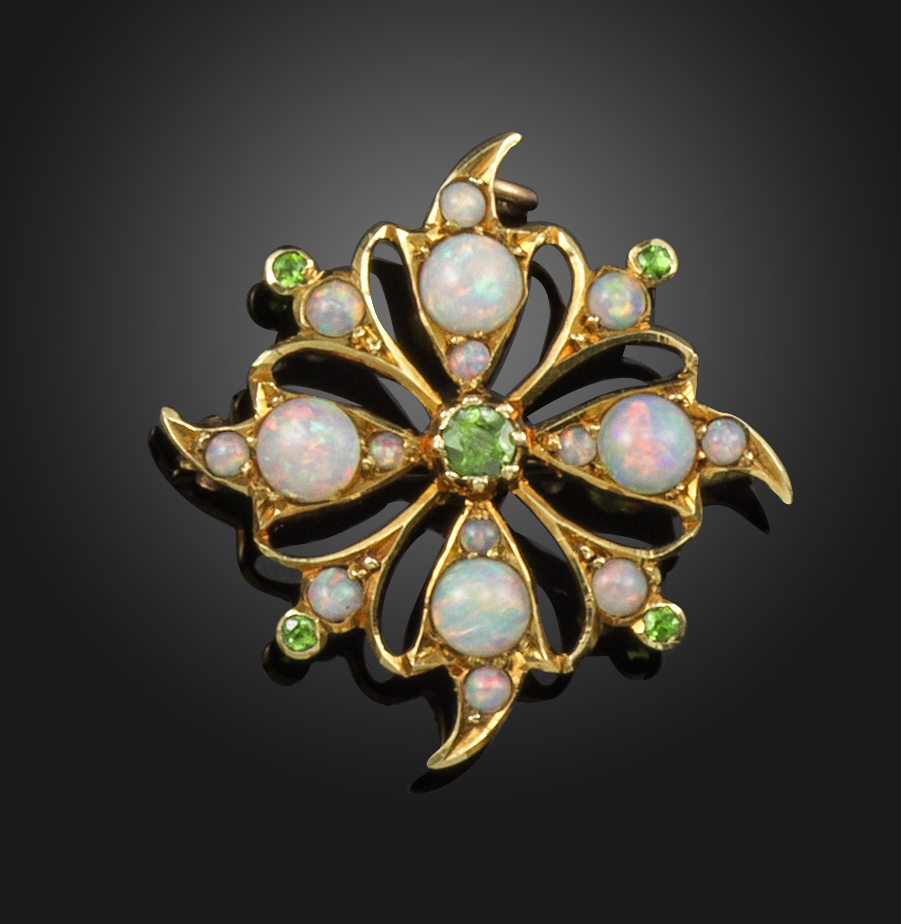 A late Victorian opal and garnet-set gold brooch, of foliate design set with cabochon opals and circular-cut green garnets in gold, 2.5cm wide, 3.5g
