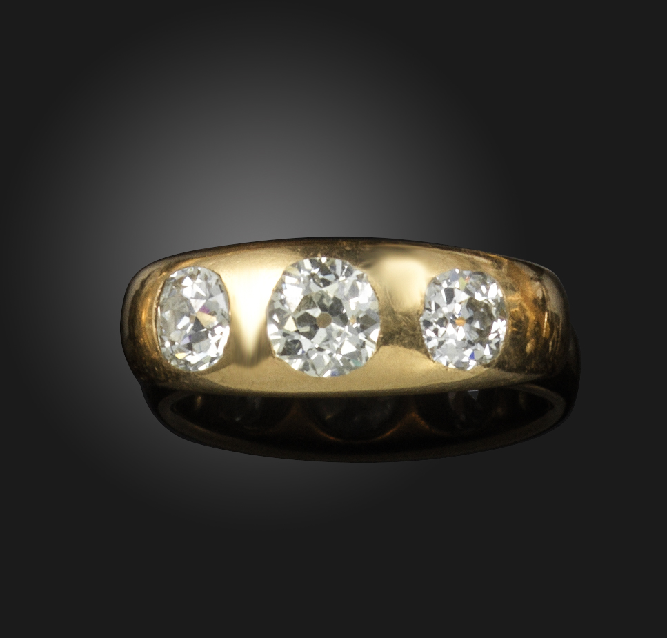 A diamond three stone gypsy ring, set with graduated old cushion-shaped diamonds weighing approximately 2.00cts in total in yellow gold, size V 1/2
