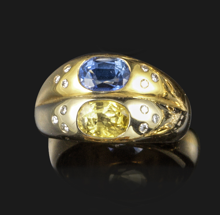 A yellow and blue sapphire and diamond ring