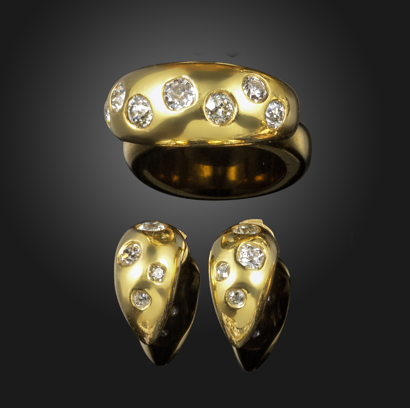 A diamond bombe ring, set with seven graduated old cushion-shaped diamonds in yellow gold, size R 1/2, with a matching pair of diamond-set gold earrings, 1.6cm high