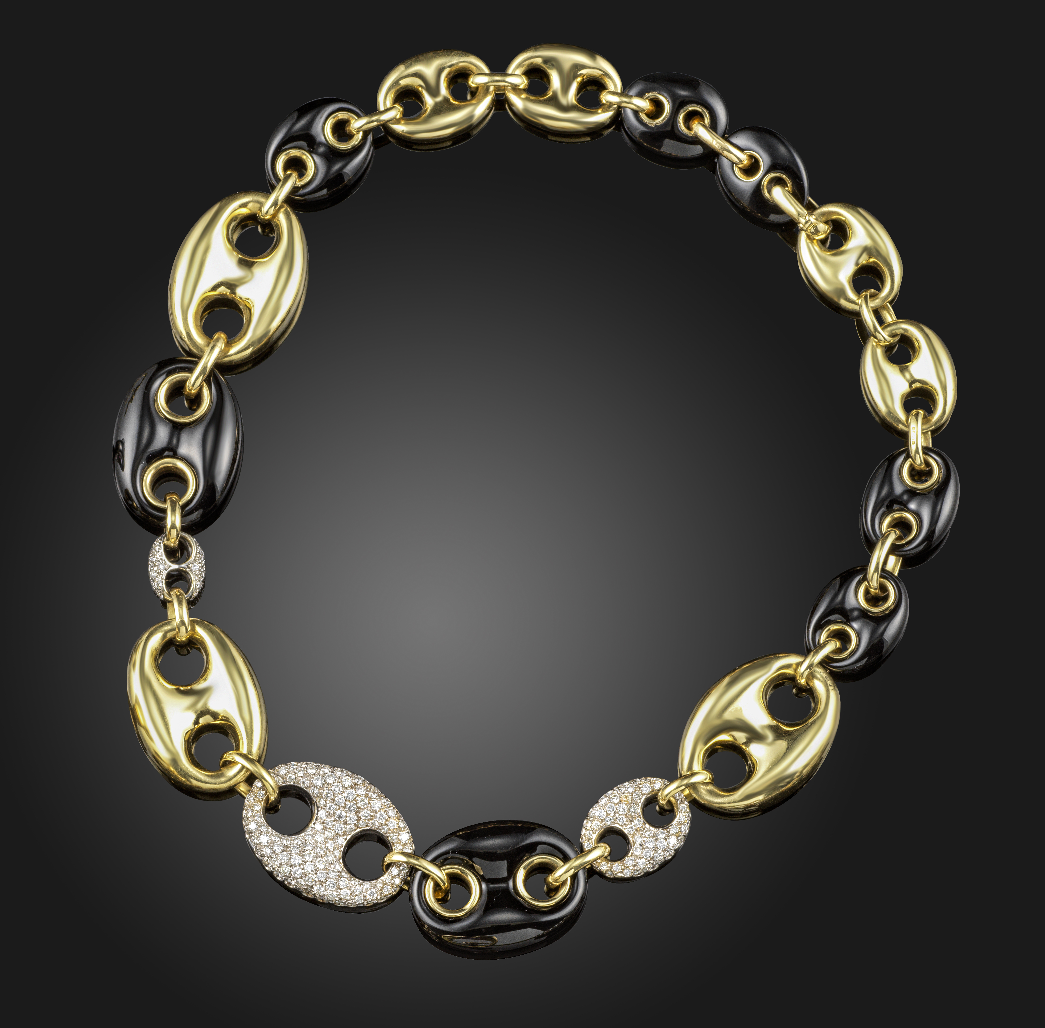 A graduated anchor-link gold necklace, the anchor-links graduate from 1.8 - 3cm wide, alternately pavé-set-set with round brilliant-cut diamonds and with black enamel decoration in 18ct gold, signed SC and with London hallmarks for 2009, 44cm long, 93g