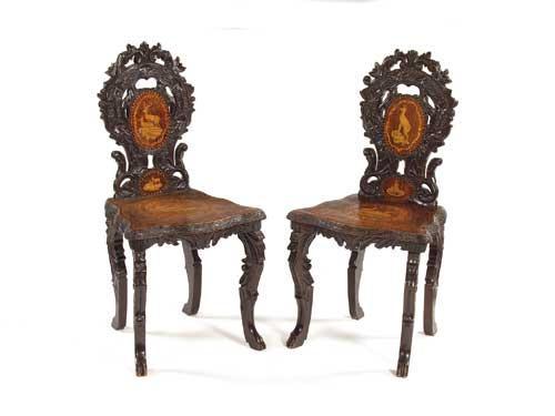 A pair of late 19th century Swiss carved walnut and marquetry inlaid side chairs