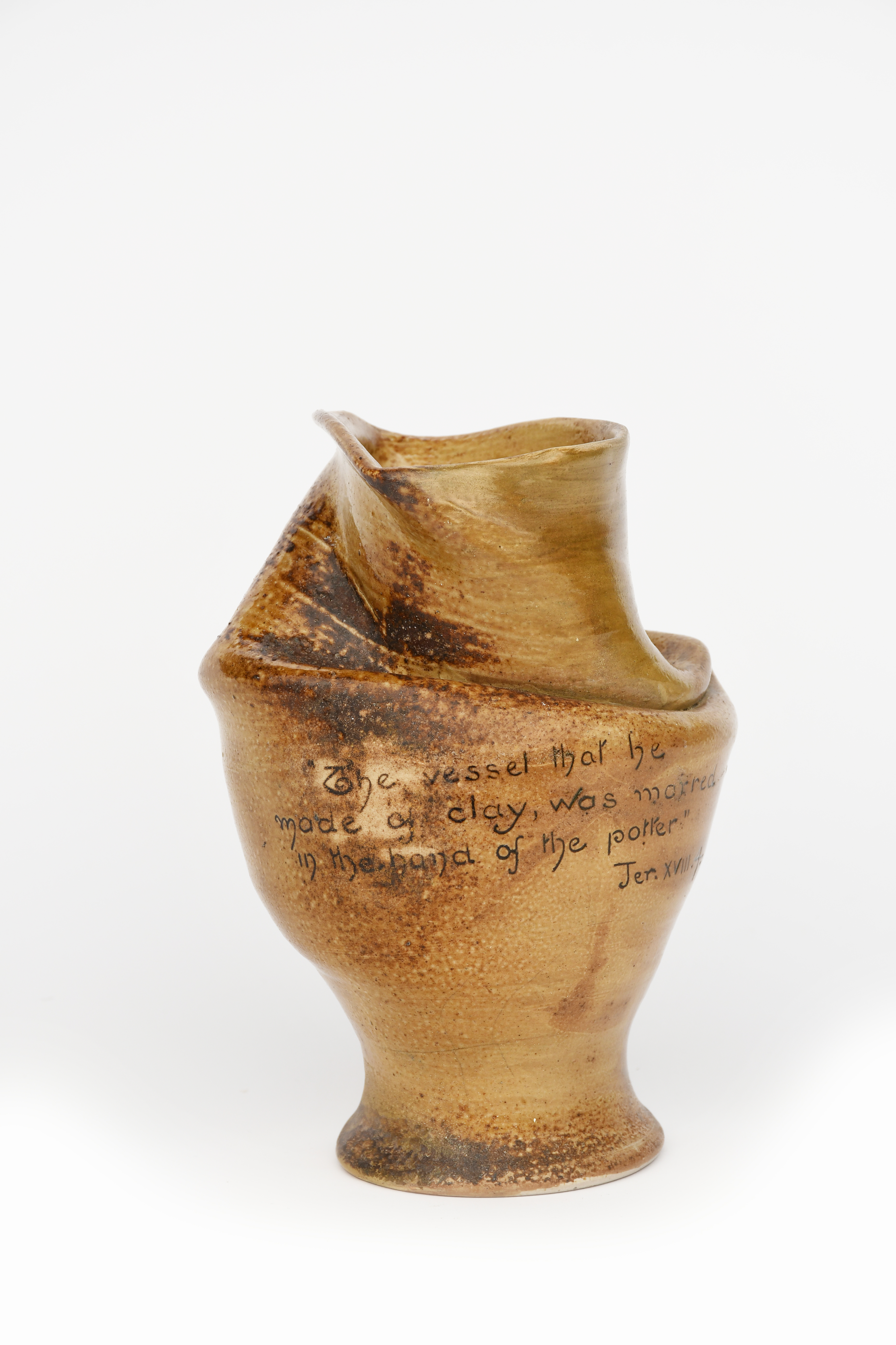 A Martin Brothers stoneware Marred pot, the compressed baluster vase inscribed The Vessel that he made of clay, was marred in the hand of the Potter, in brown on a tan ground, 8-1898 Martin Bros London & Southall, professionally restored, 18cm. high