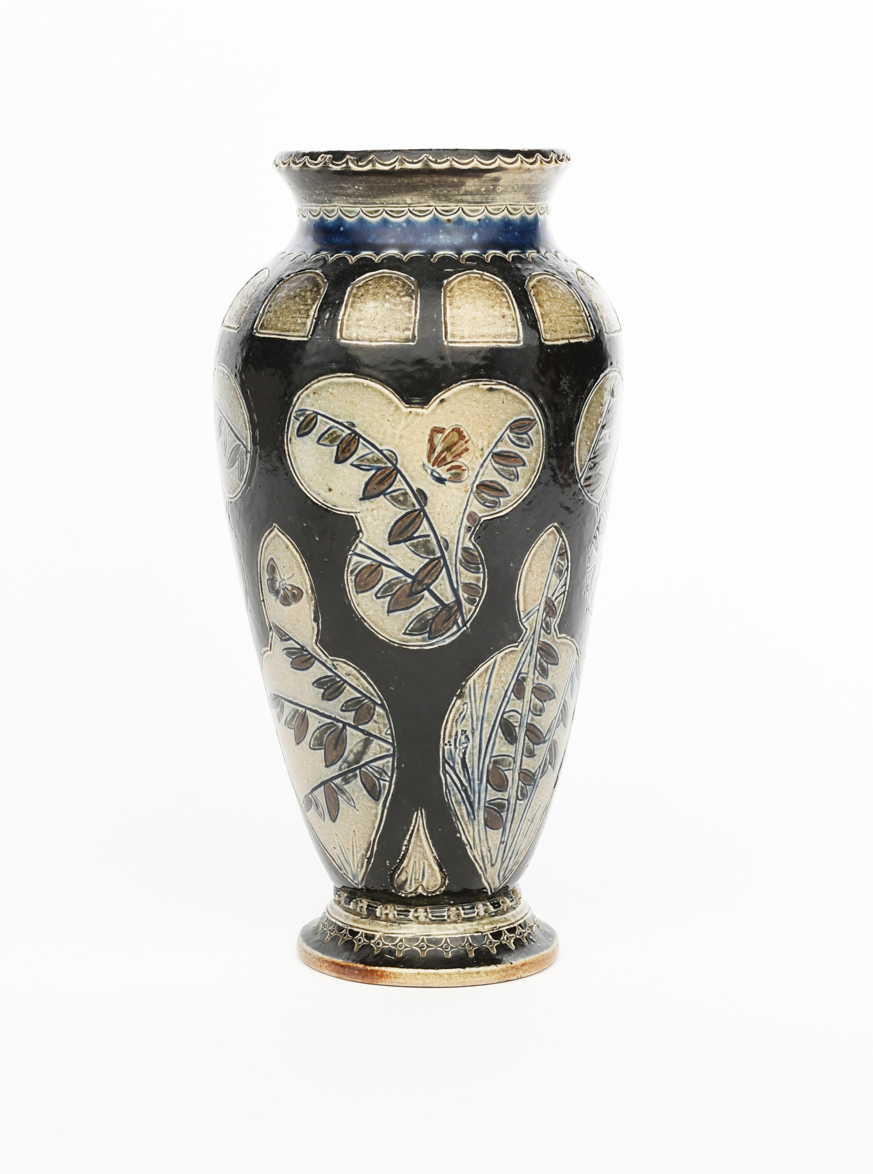 An early Martin Brothers stoneware vase by Robert Wallace Martin, dated 1875, shouldered form, incised with butterflies amongst foliage shown through tracery design in brown and blue on a buff ground, incised C2 R W Martin London 11-75, fine stress hairline to neck, professional restoration to foot rim, 27cm. high