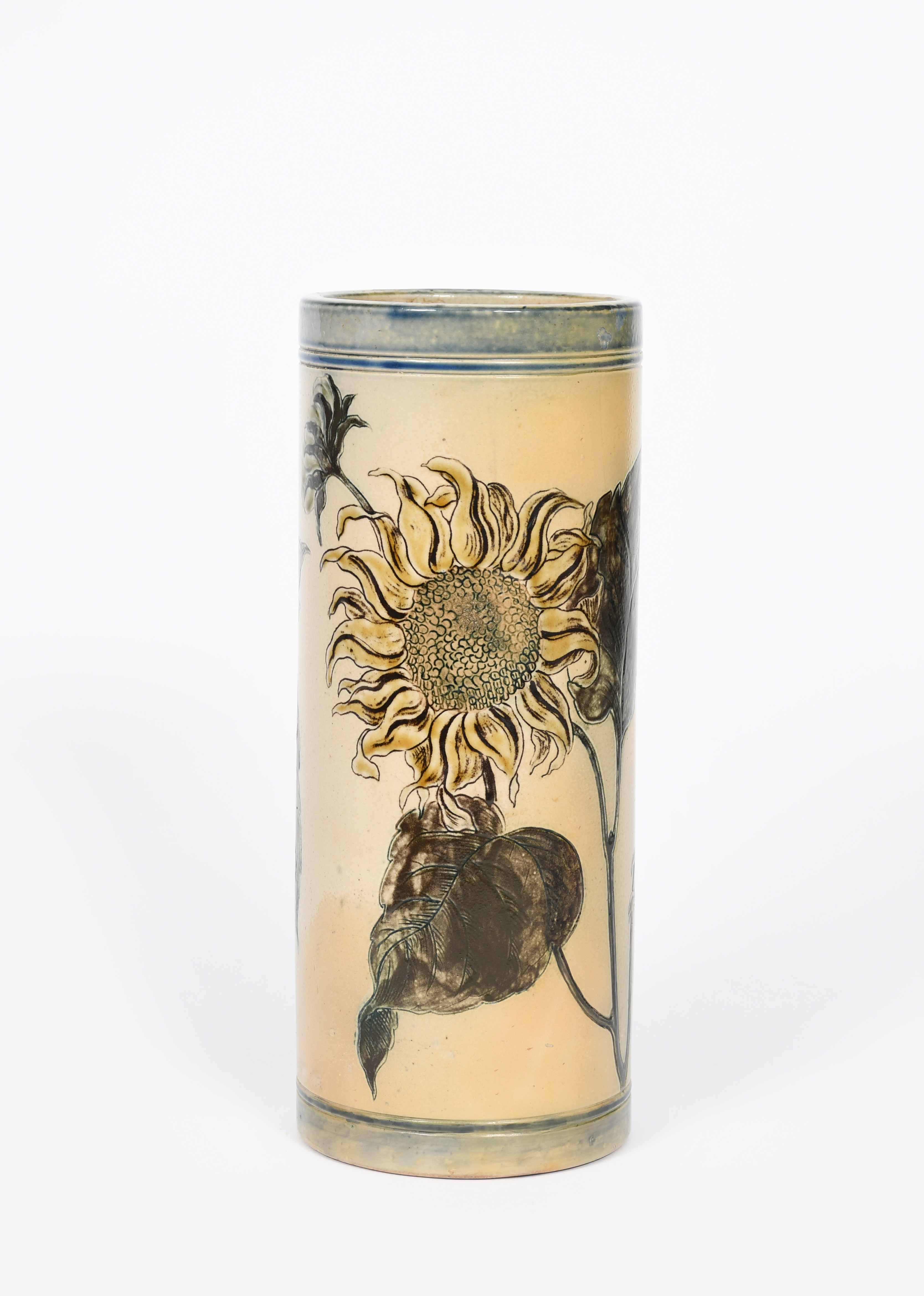 An Aesthetic Movement Martin Brothers stoneware vase by Robert Wallace Martin, dated 1883, cylindrical form, incised with sunflowers, in ochre and yellow on a buff ground, incised 31.5.83, R W Martin & Bros, London & Southall, restored, 24.5cm. high