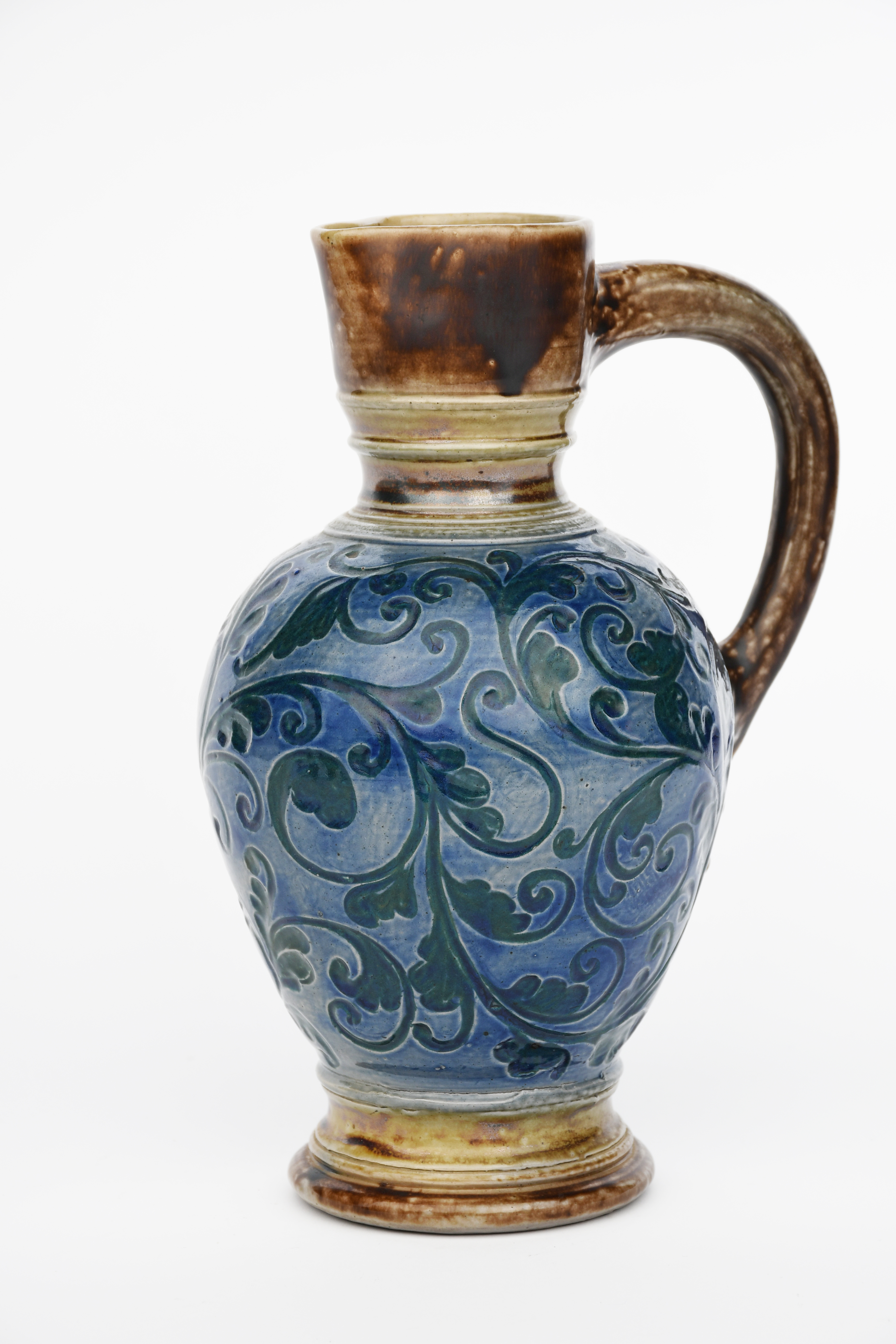 A Martin Brothers stoneware jug by Robert Wallace Martin, shouldered ovoid form with collar neck and applied handle, incised with scrolling foliage in green and blue on a brown ground, incised R W Martin London & Southall, , 25cm. high