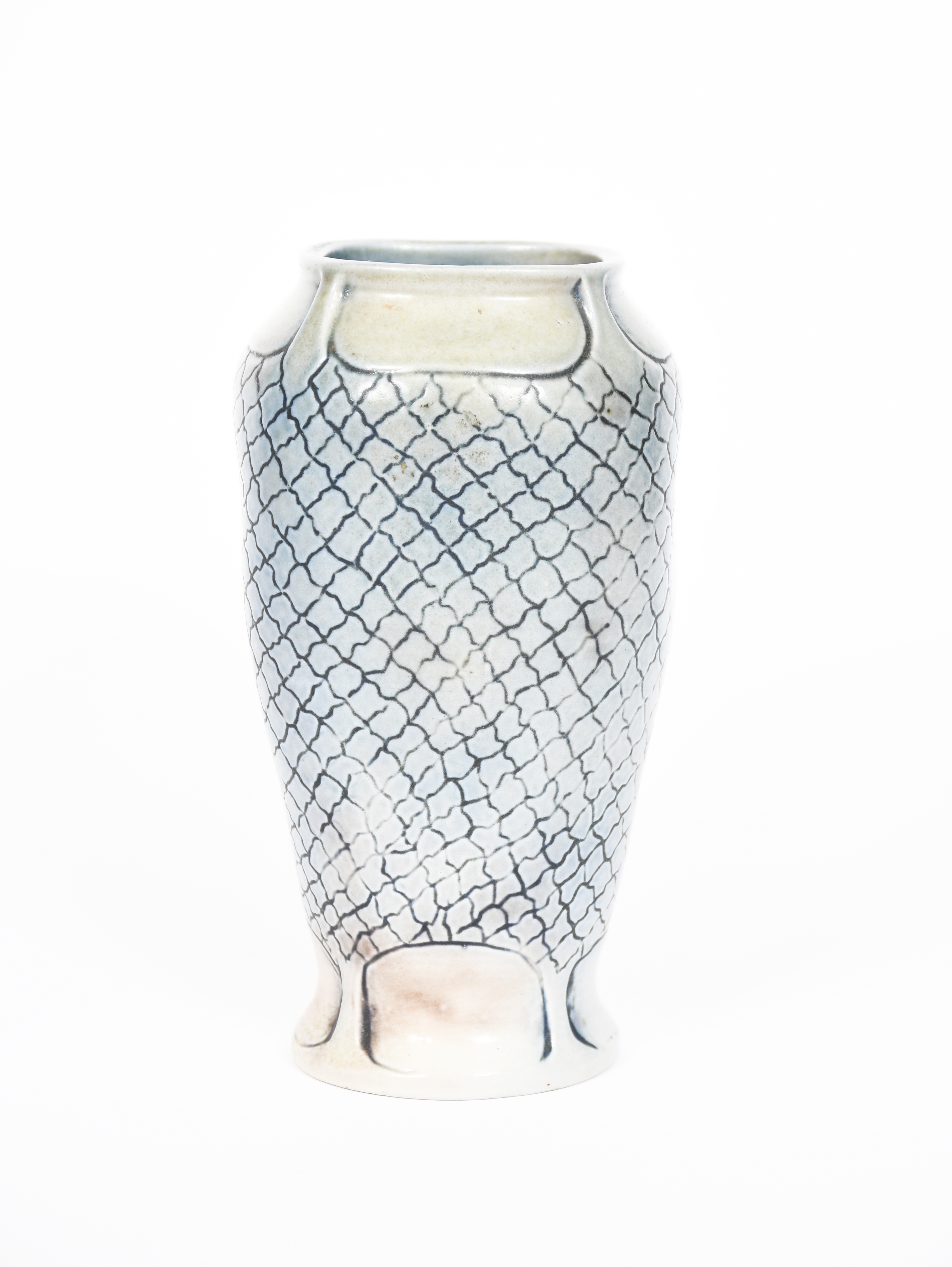 A Martin Brothers stoneware vase, shouldered square section, incised in low relief with a hanging net design, in blue on a silver-grey ground, R W Martin & Brothers Southall, 18.5cm. high