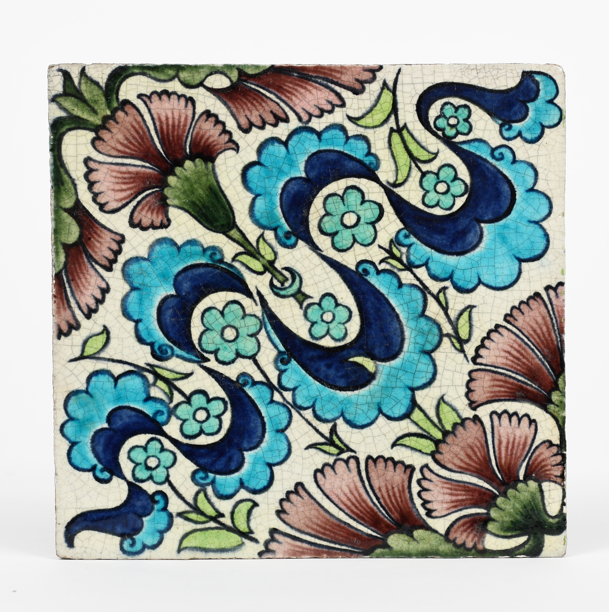 A William De Morgan Late Fulham Period Persian tile, painted with carnation flowers in blue, turquoise, aubergine and green on a white ground, impressed factory mark, 15.5cm. square