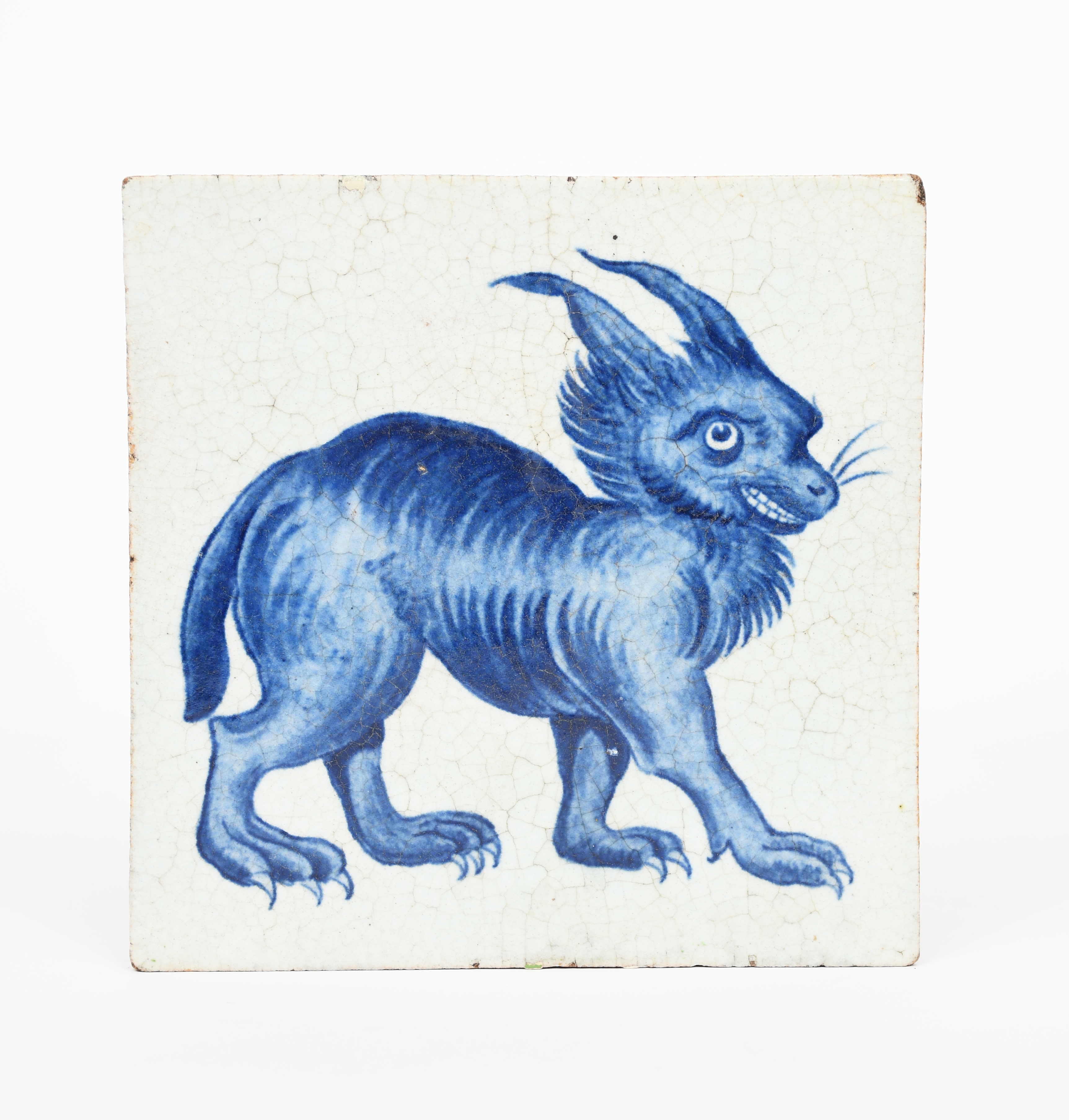 A William De Morgan Late Fulham Period Lynx tile, painted with a lynx creature walking, in blue on a white ground impressed factory mark, 15.5cm. square