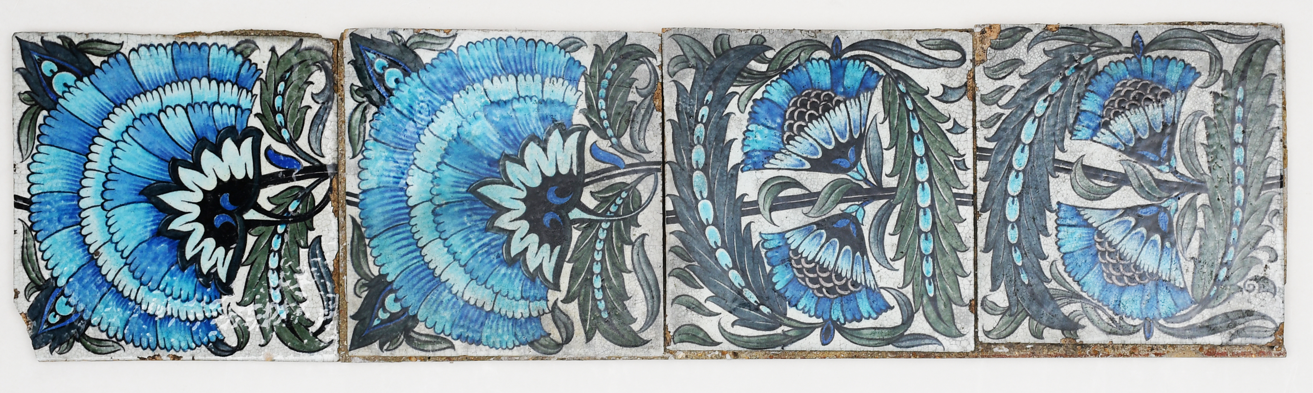 Four large William De Morgan Early Fulham Period Fan tiles, each painted with a Persian flower design in blue, green and aubergine on a white ground, impressed factory marks, three mounted, chips, 21cm. square (2)
