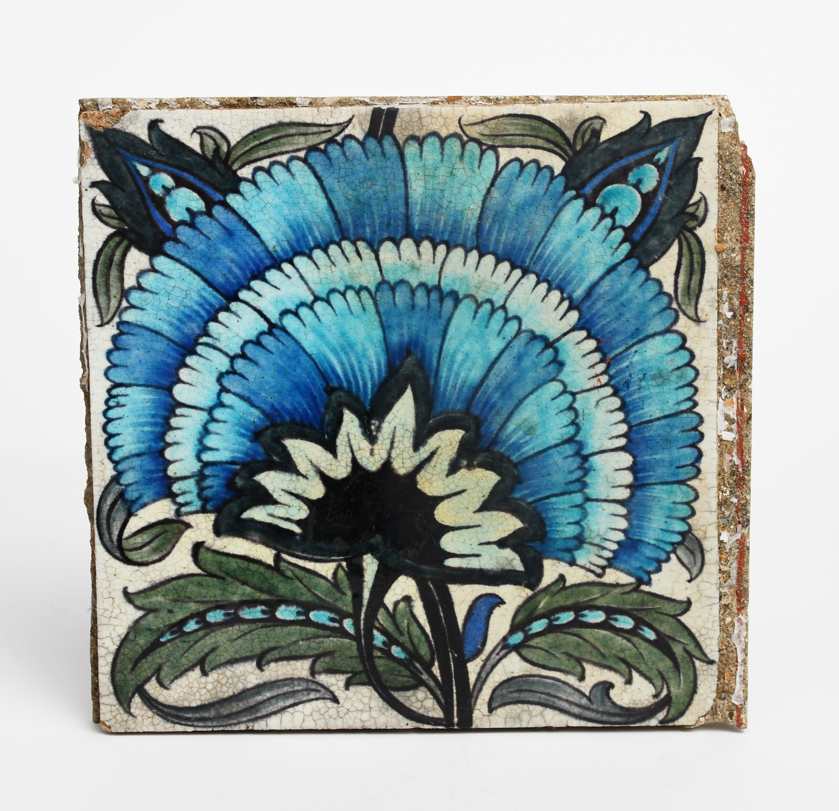 A William De Morgan Sands End Pottery large tile, painted with a fan flower in blue, green and black on a white ground, impressed marks concealed with mortar, minor rim chips, 20.5cm. square