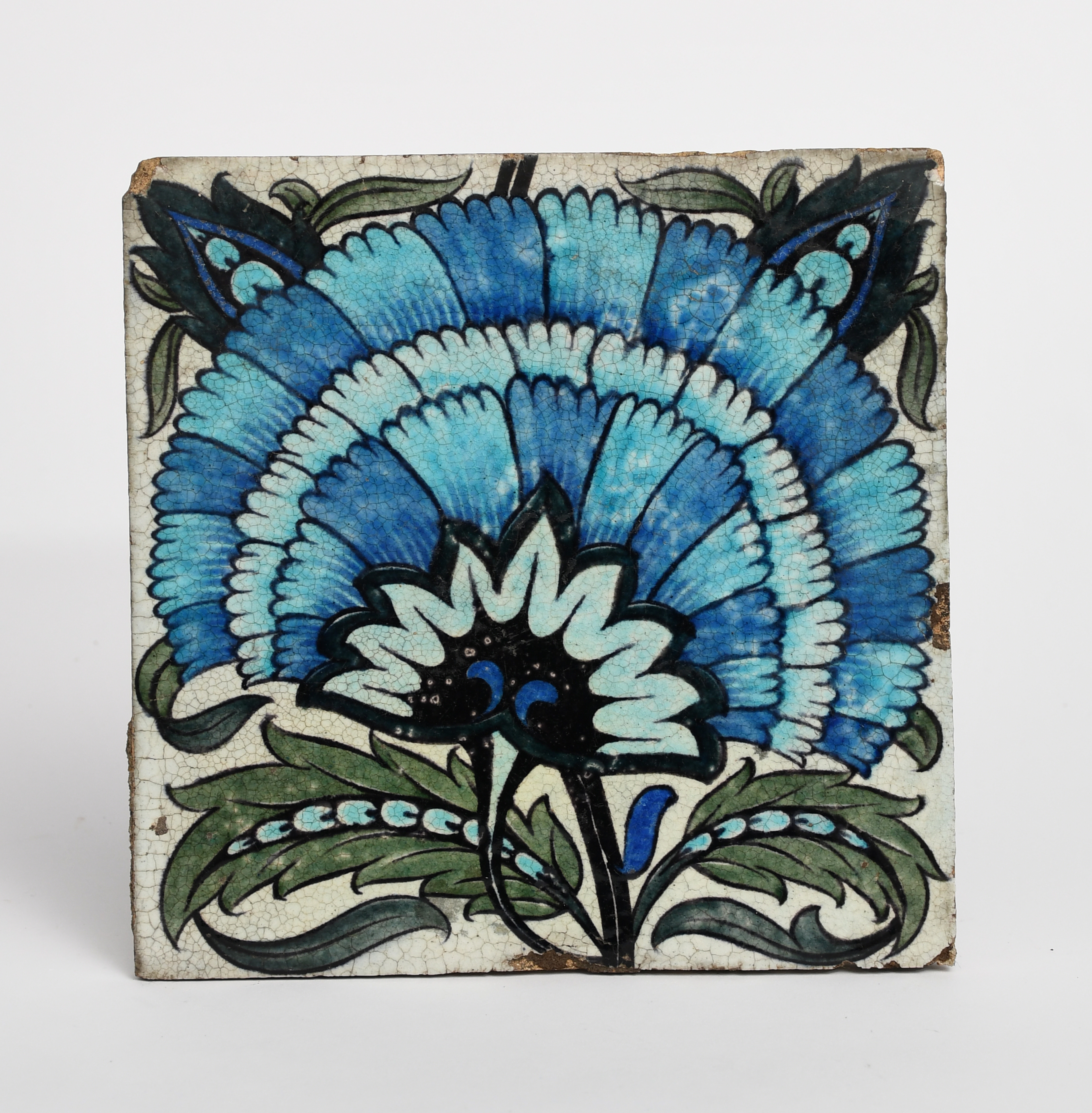A William De Morgan Sands End Pottery large tile, painted with a fan flower in blue, green and black on a white ground, impressed marks, minor rim chips, 20.5cm. square