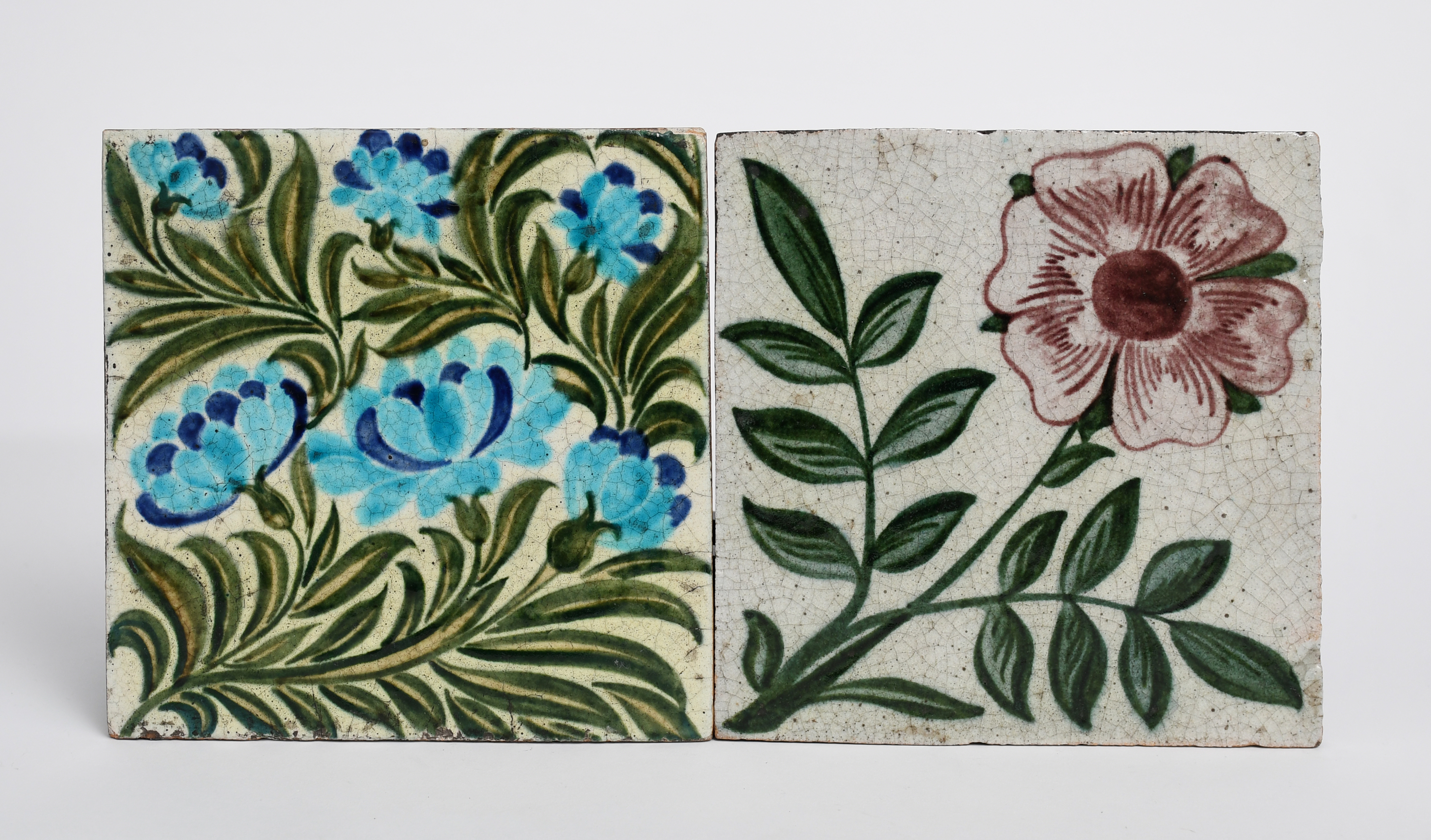 A William De Morgan Chelsea Period Single Rose tile, painted in aubergine and green on a white ground, and a William De Morgan tile painted with blue flowers, impressed marks, 15.5cm. square, (2)