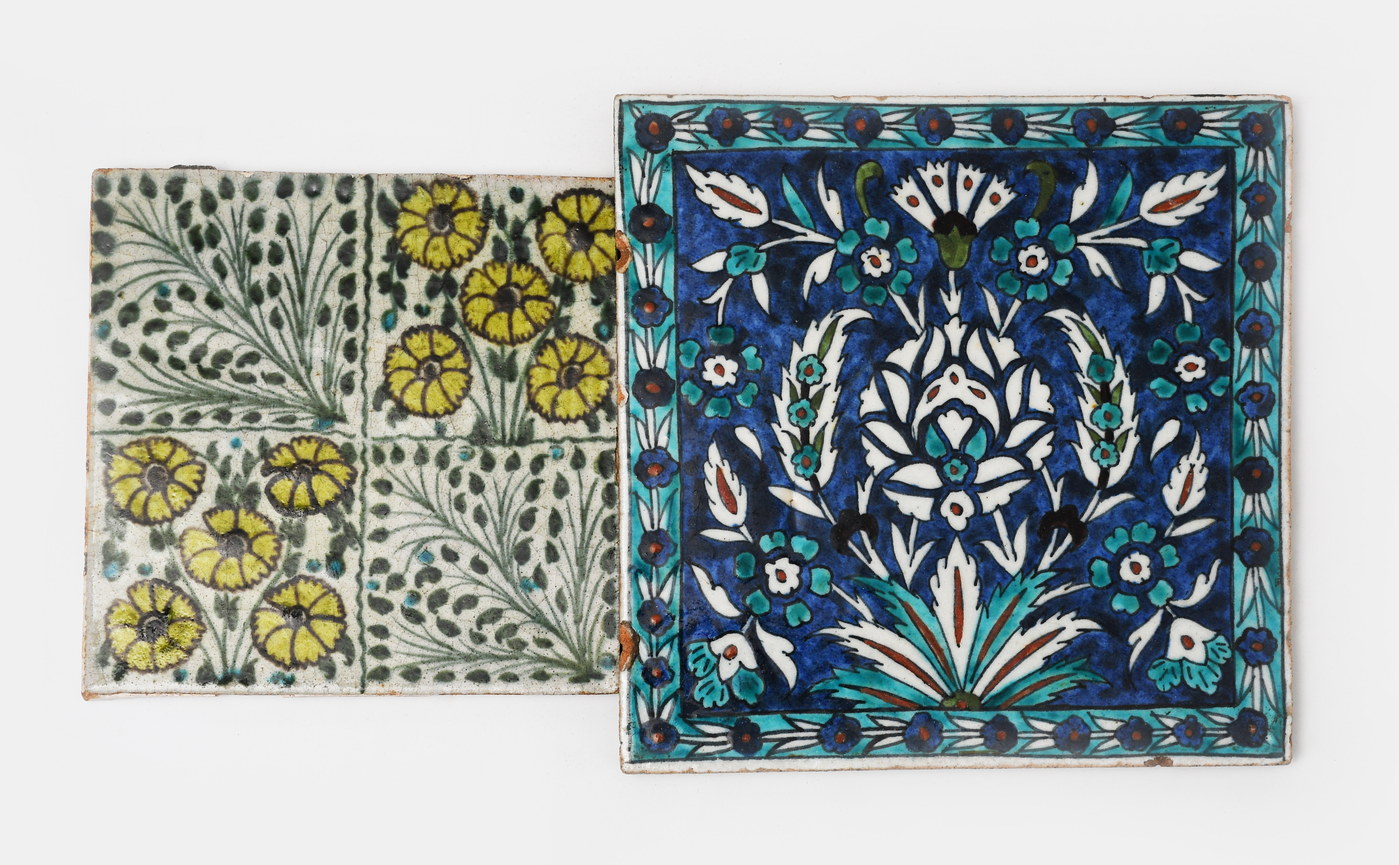 A William De Morgan Chelsea Period Bedford Park Anemone tile, painted in shades of green, turquoise, yellow and aubergine on a white ground, ten Wedgwood Months of the Year tiles designed by William Wise, comprising, January, February, May, June, July, August, September, October, November and December printed in blue on a white ground, a large Persian tile probably English and sixteen other tiles, impressed factory marks, 15.5cm. square, (28)