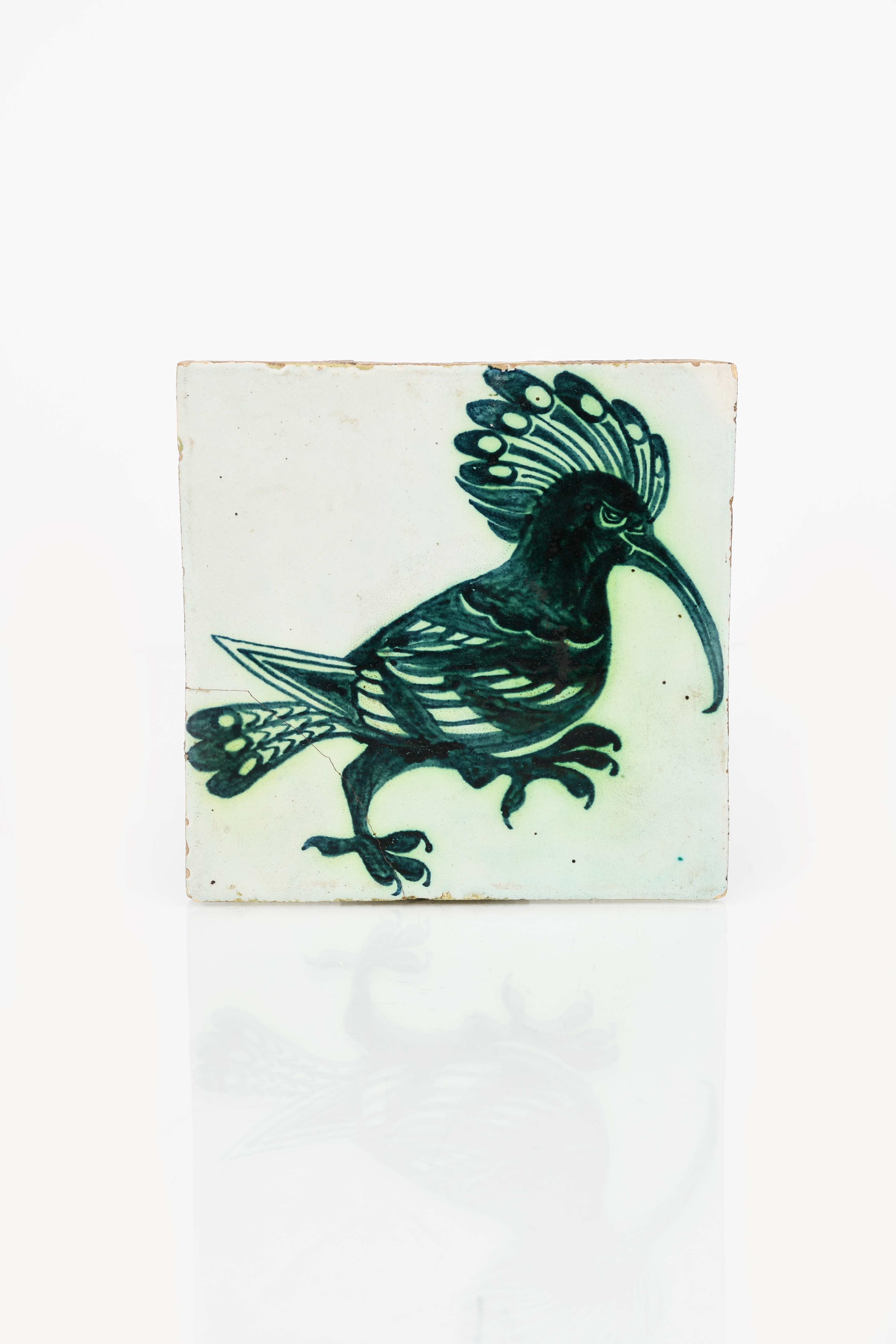An early William De Morgan Hoopoe tile, painted with a standing bird in blue on an off white ground unsigned, re-stuck corner, 15.4cm. square