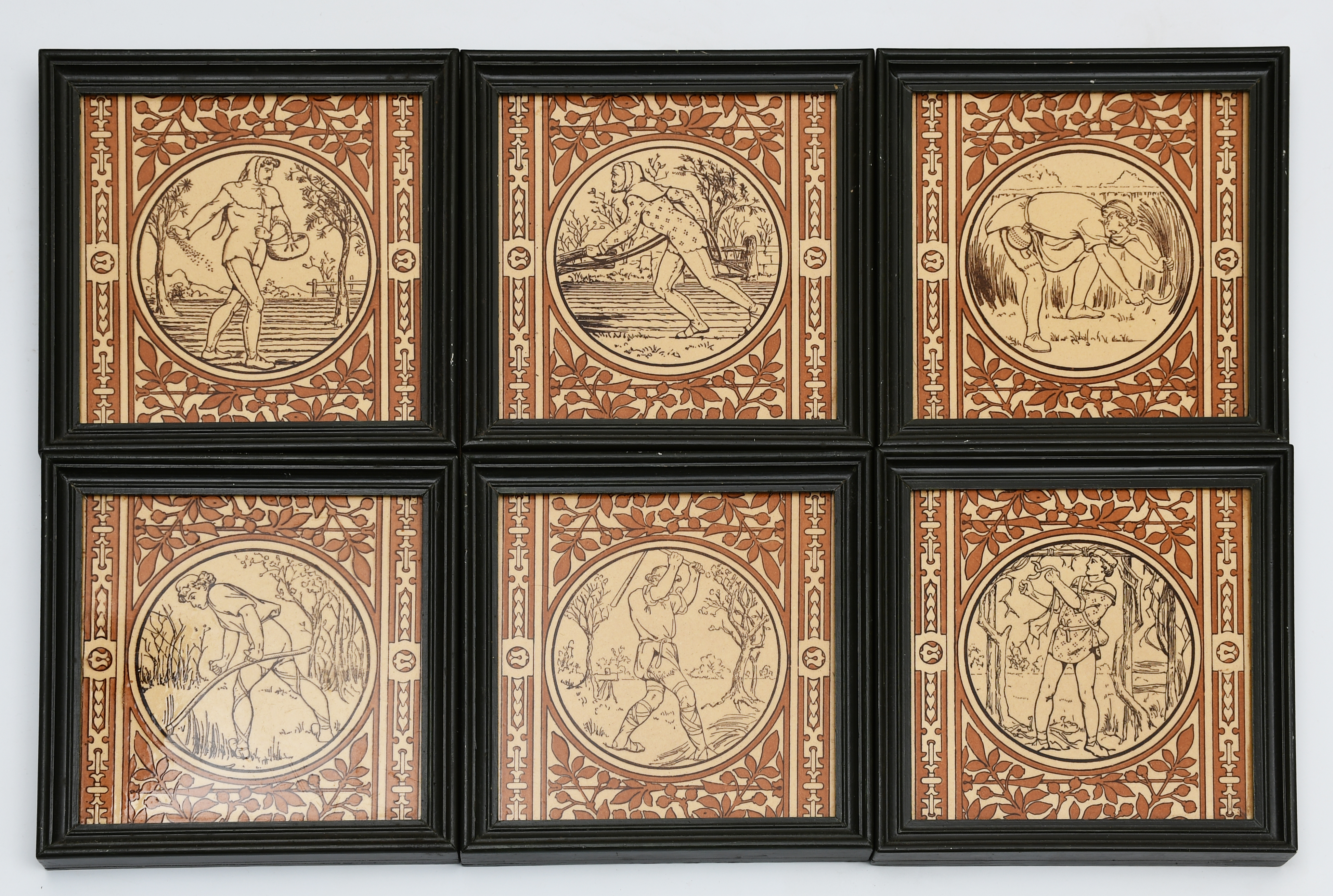 Six Minton's large tiles designed by John Moyr Smith, each printed in brown on a tan ground, individually framed, marks concealed in framing, 19.5cm. square (tiles), (6)