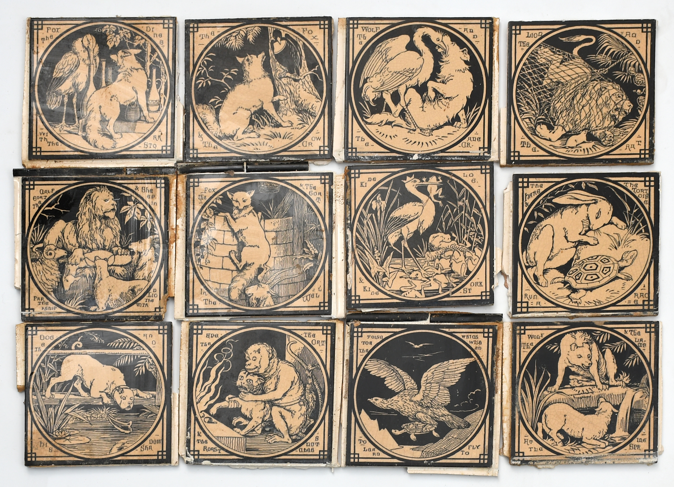 Twelve Minton Aesops Fables tiles designed by John Moyr Smith, printed in black on a tan ground, impressed marks, cement residue, 15.5.cm. square (12)