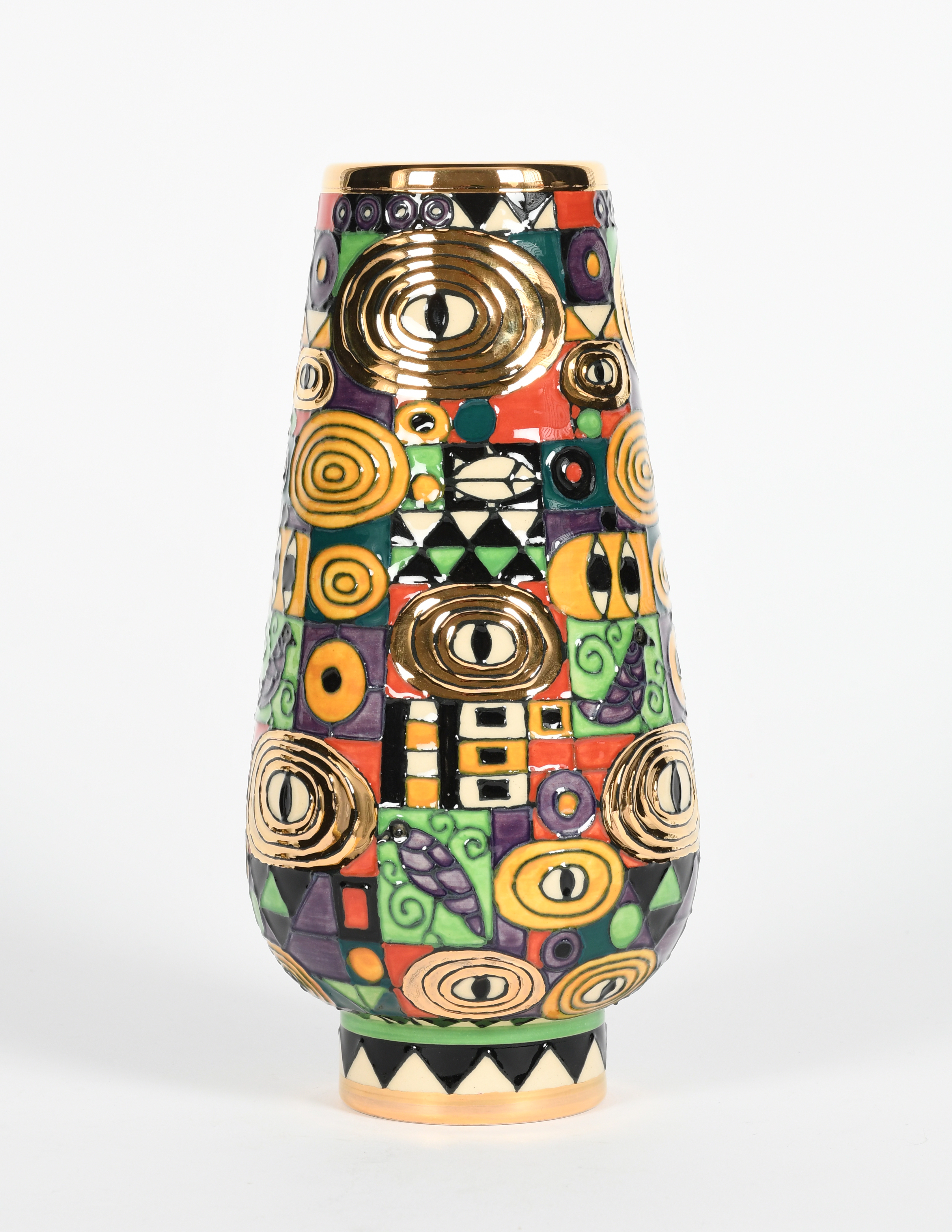 'Klimt Pattern' a Dennis China Works limited edition Bud vase designed by Sally Tuffin, dated 2019, painted by Theresa Blackmore, thrown by Rory McLeod, tubeline decorated in colours and gilt inspired by Gustav Klimt, impressed and painted marks, 20.5cm. high