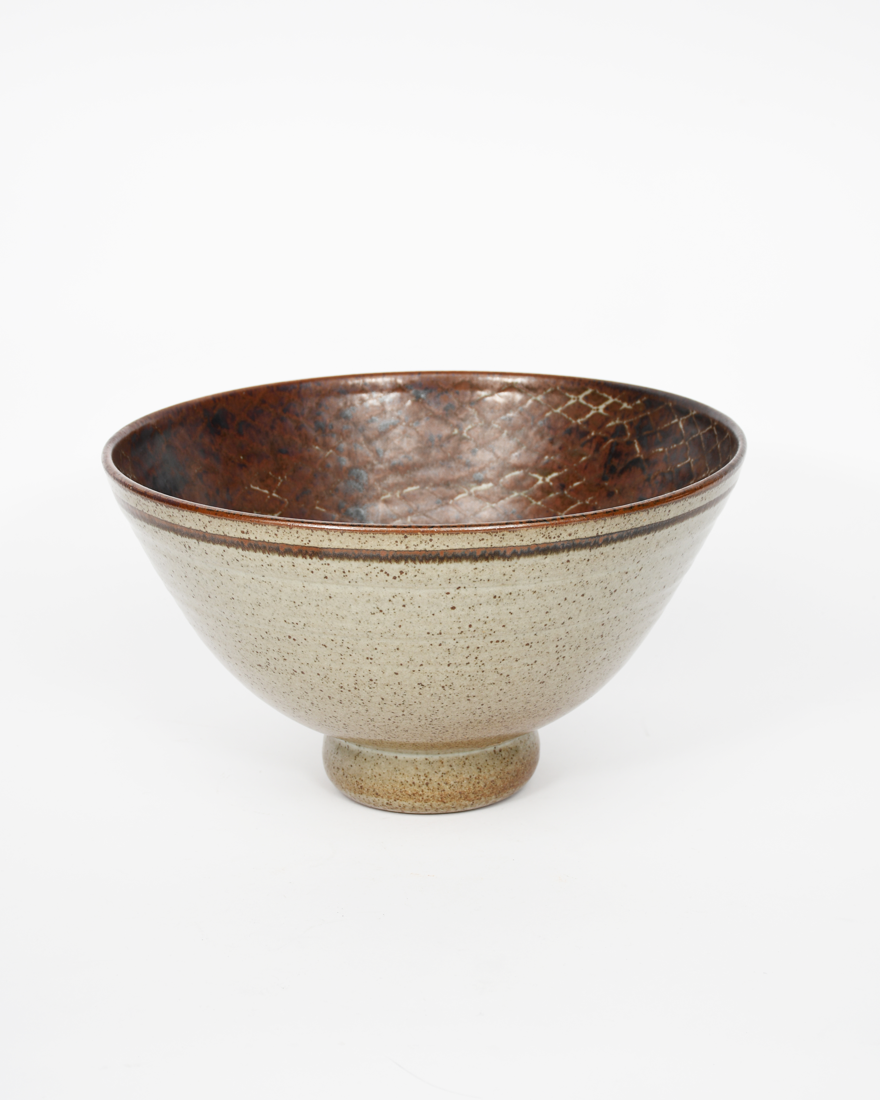 footed, flaring stoneware bowl, resist decorated to the interior with a net design in tenmoku on ash, the exterior ash glazed impressed LJ seal mark, 20cm. high, 35cm diam.