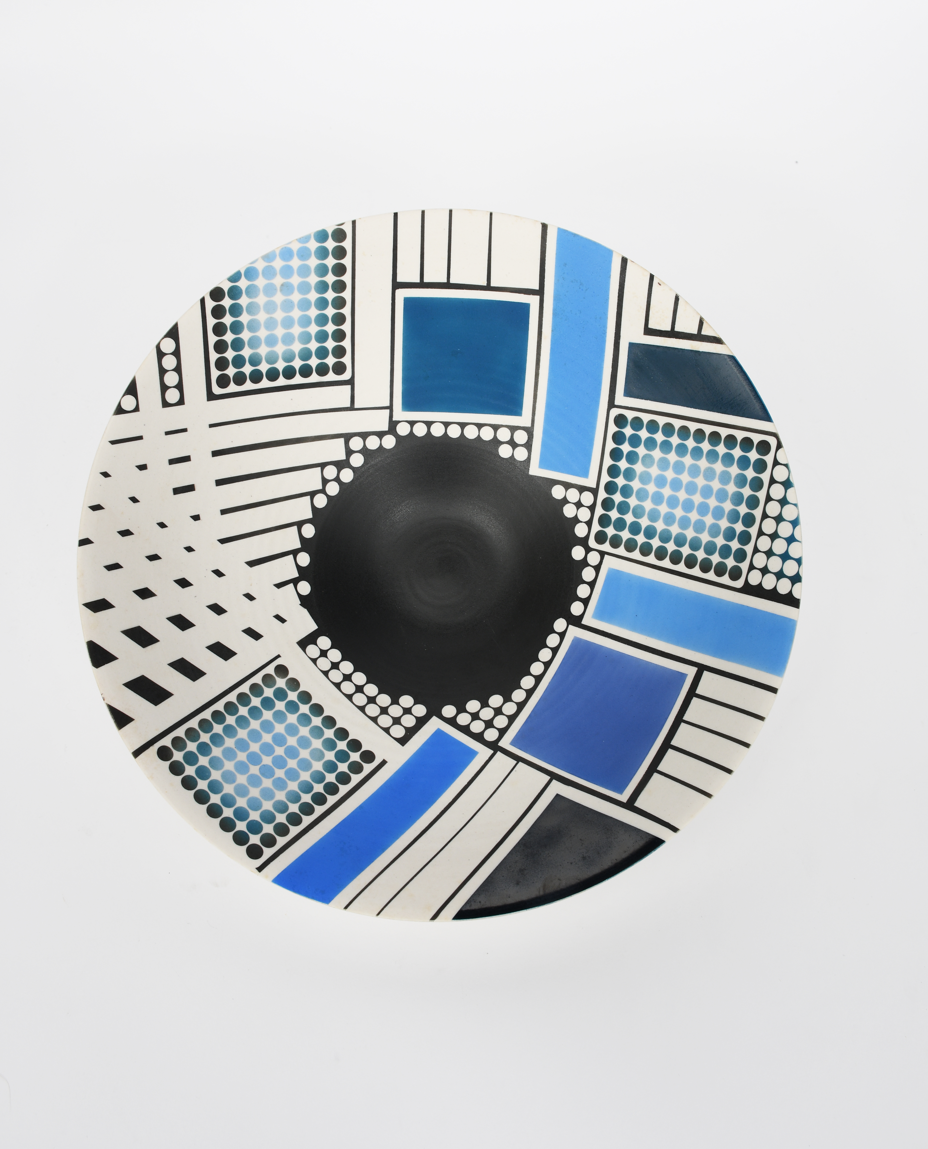 a porcelain bowl, spray glazed in black and blue with geometric design, incised signature 32cm. diam.