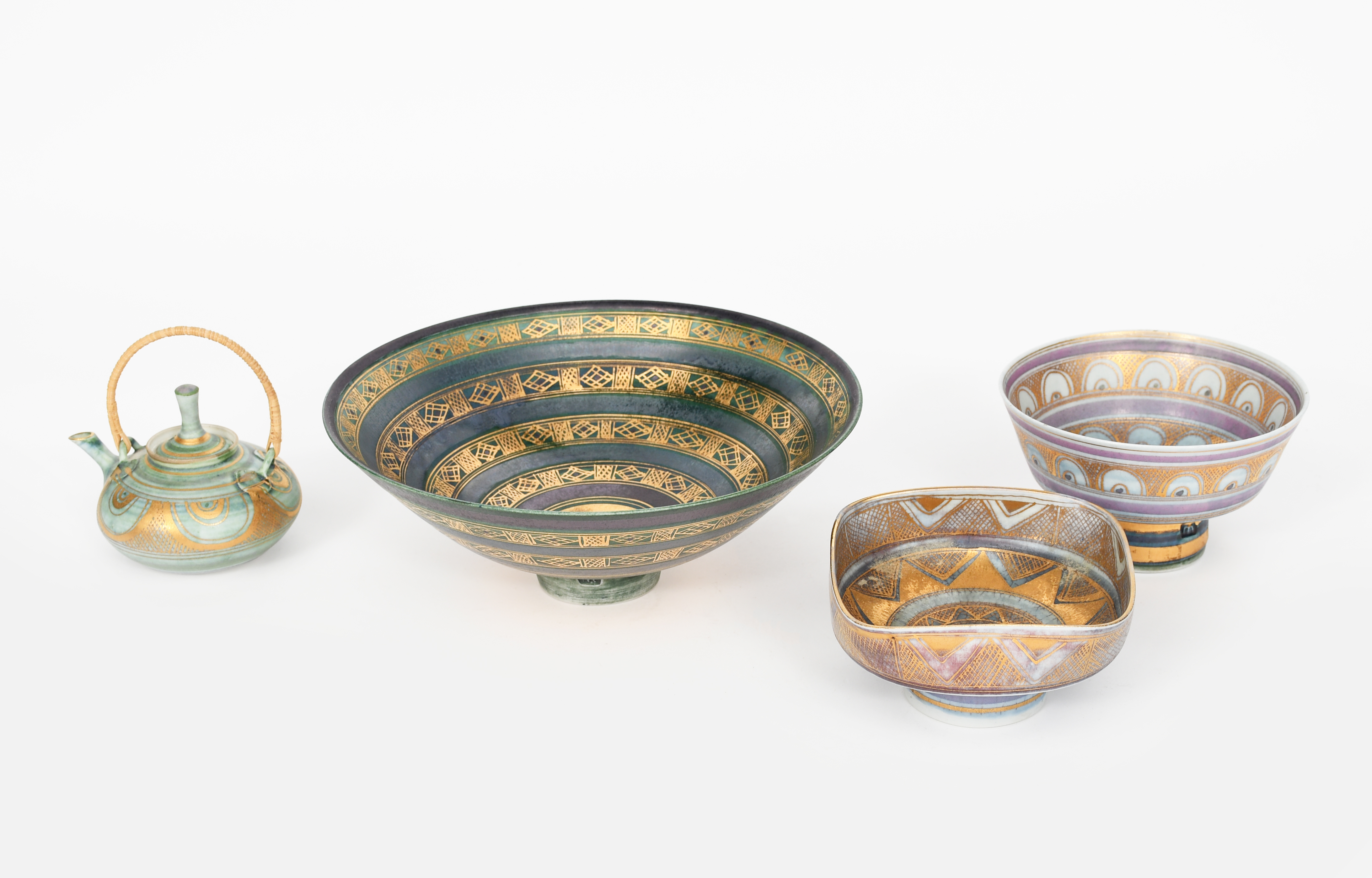 a footed porcelain bowl, dark purple and blue lustre highlighted with gilt bands inside and out, two other smaller Mary Rich bowls and a small teapot and cover by Mary Rich impressed seal marks, 22.5cm. diam. 9cm. high (bowl), (5)