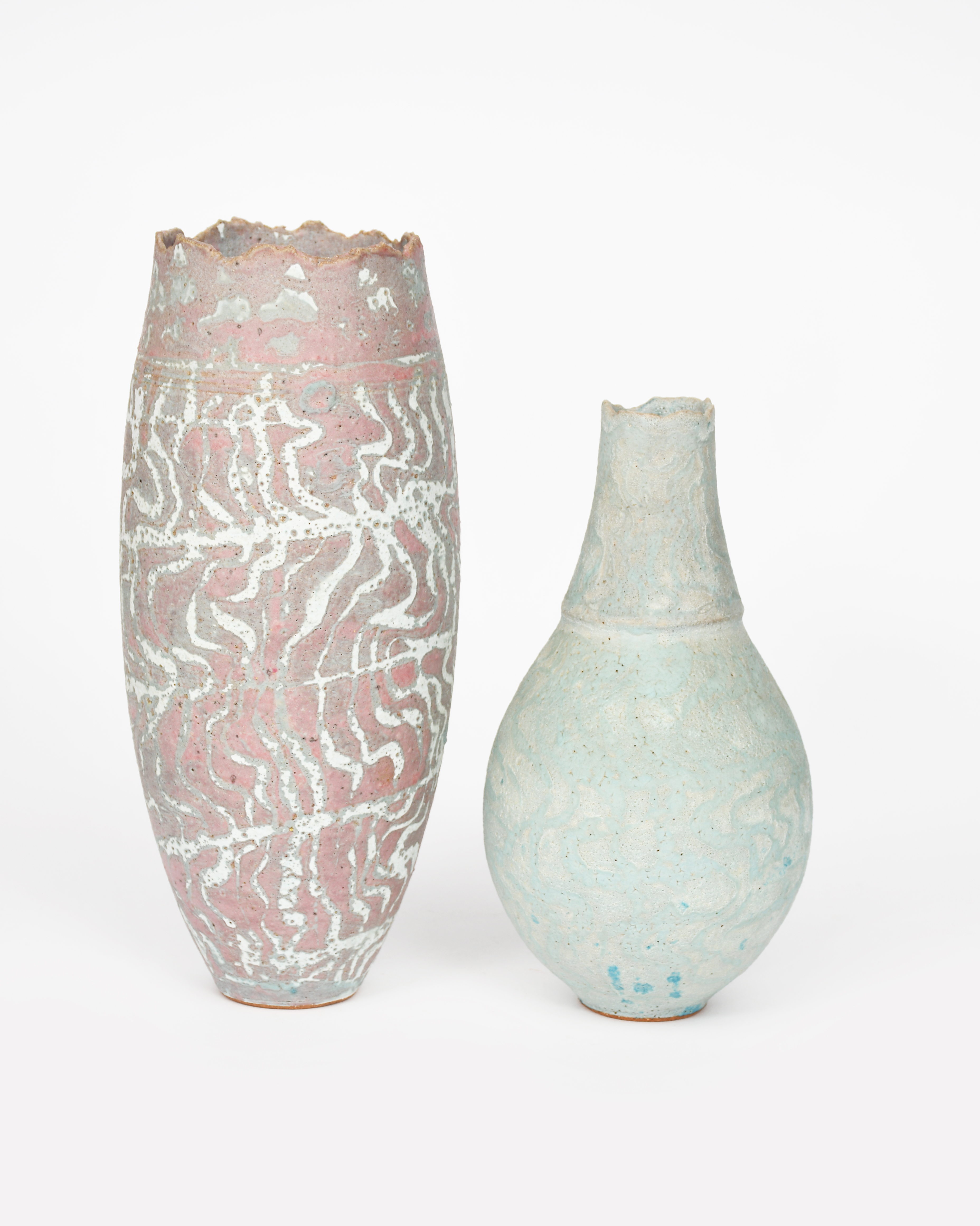 a tall swollen vase with inlaid porcelain bands, in turquoise on a pink ground, and another swollen vase with turquoise decoration by Peter Beard impressed seal marks, 31cm and 25cm high, (2)