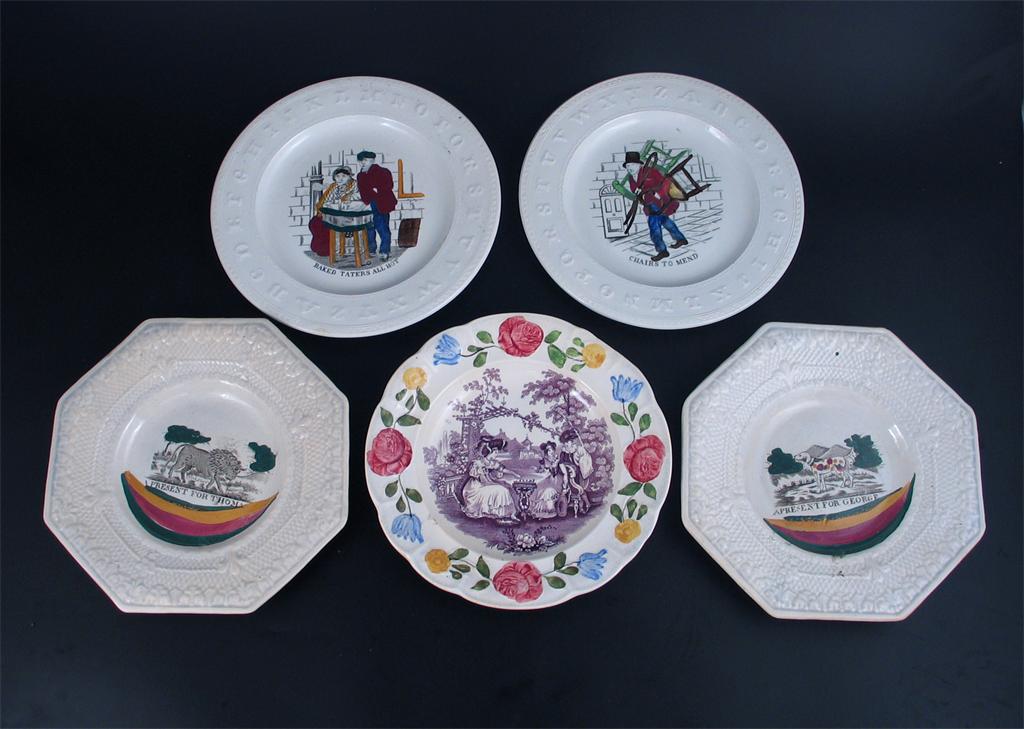 Five pottery plates, two with the alphabet moulded around the rims, one inscribed 'A present for George', another 'A present for Thomas', the fifth printed with figures. Minor faults. All 19th century, 22cm. (5)