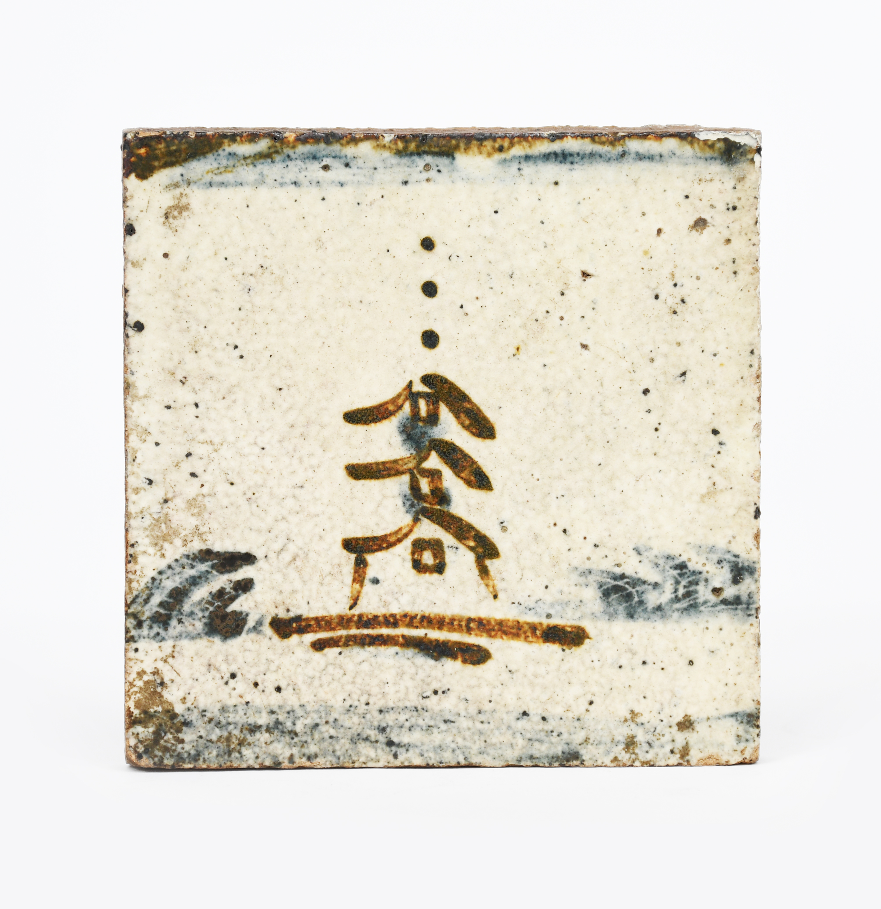 a Leach Pottery tile, painted with a pagoda, in tenmoku and blue on a pitted oatmeal ground, impressed Leach Pottery seal marks to back, 10cm. square