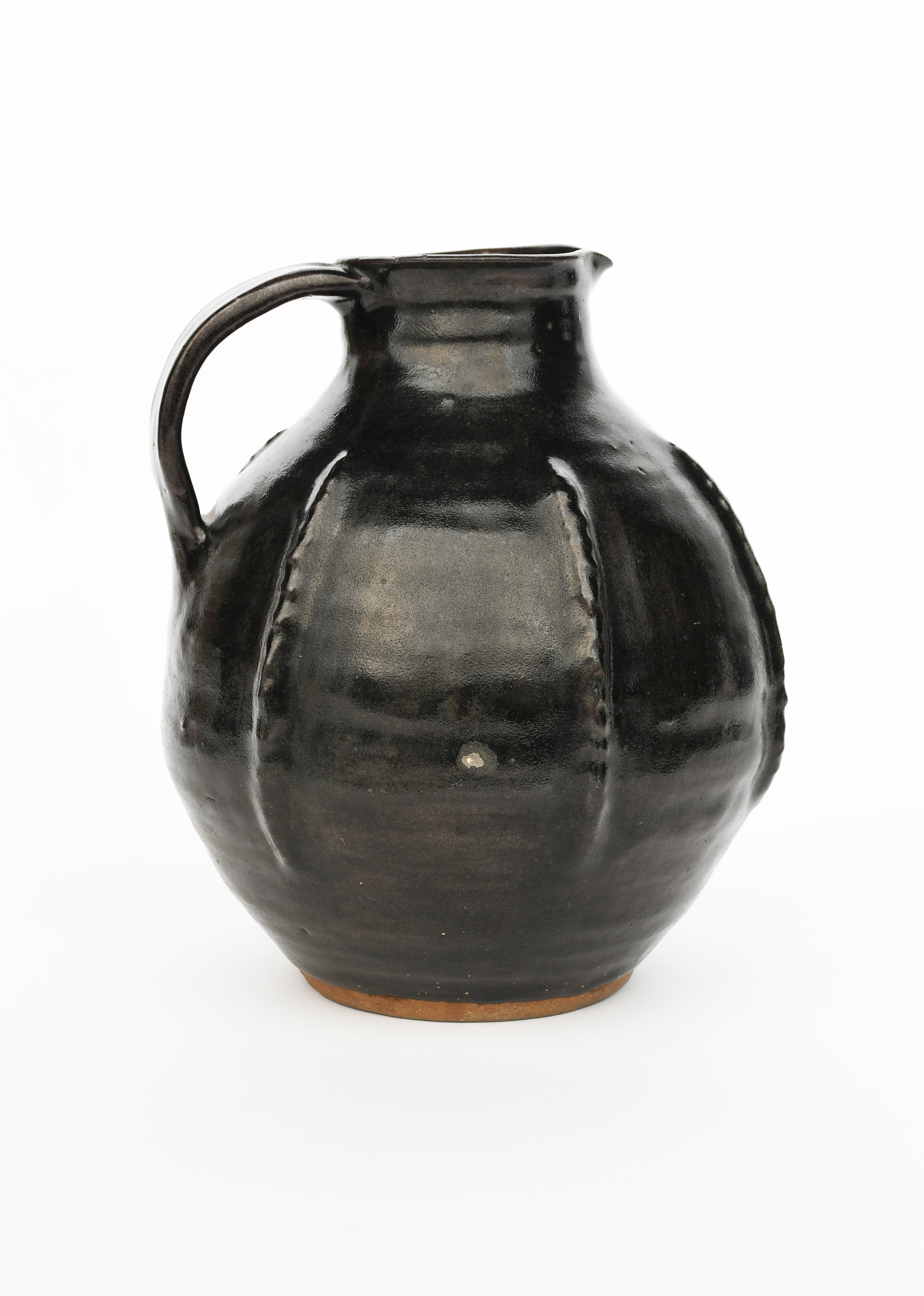 a large stoneware jug, bellied form with vertical raised ribs, covered in a rich tenmoku glaze, impressed seal mark, 28.5cm. high