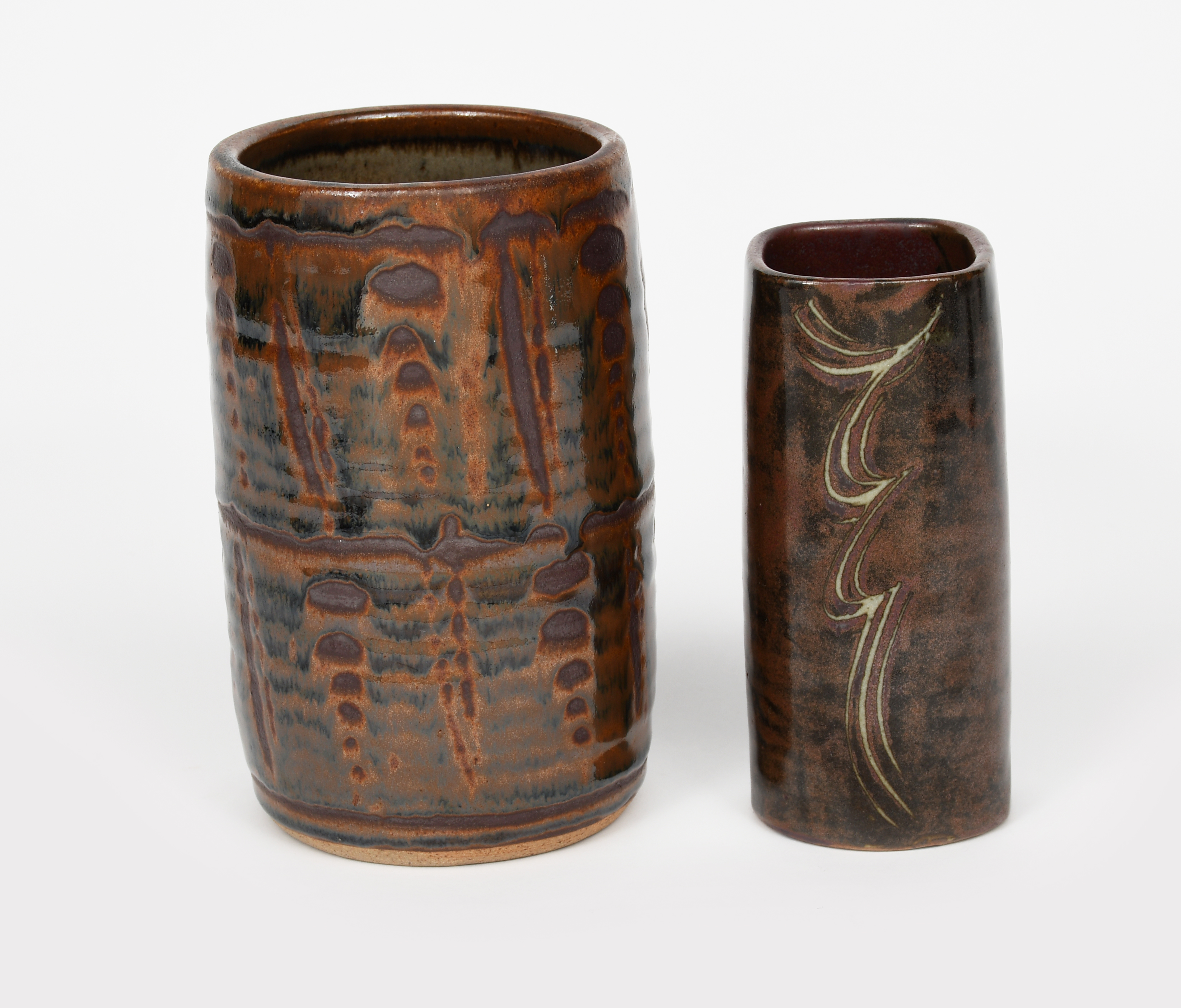 a Lowerdown Pottery stoneware vase, square section, covered in a running tenmoku glaze, one face with combed decoration, and another Lowerdown Pottery vase probably by David Leach impressed seal marks, 16cm. high (2)