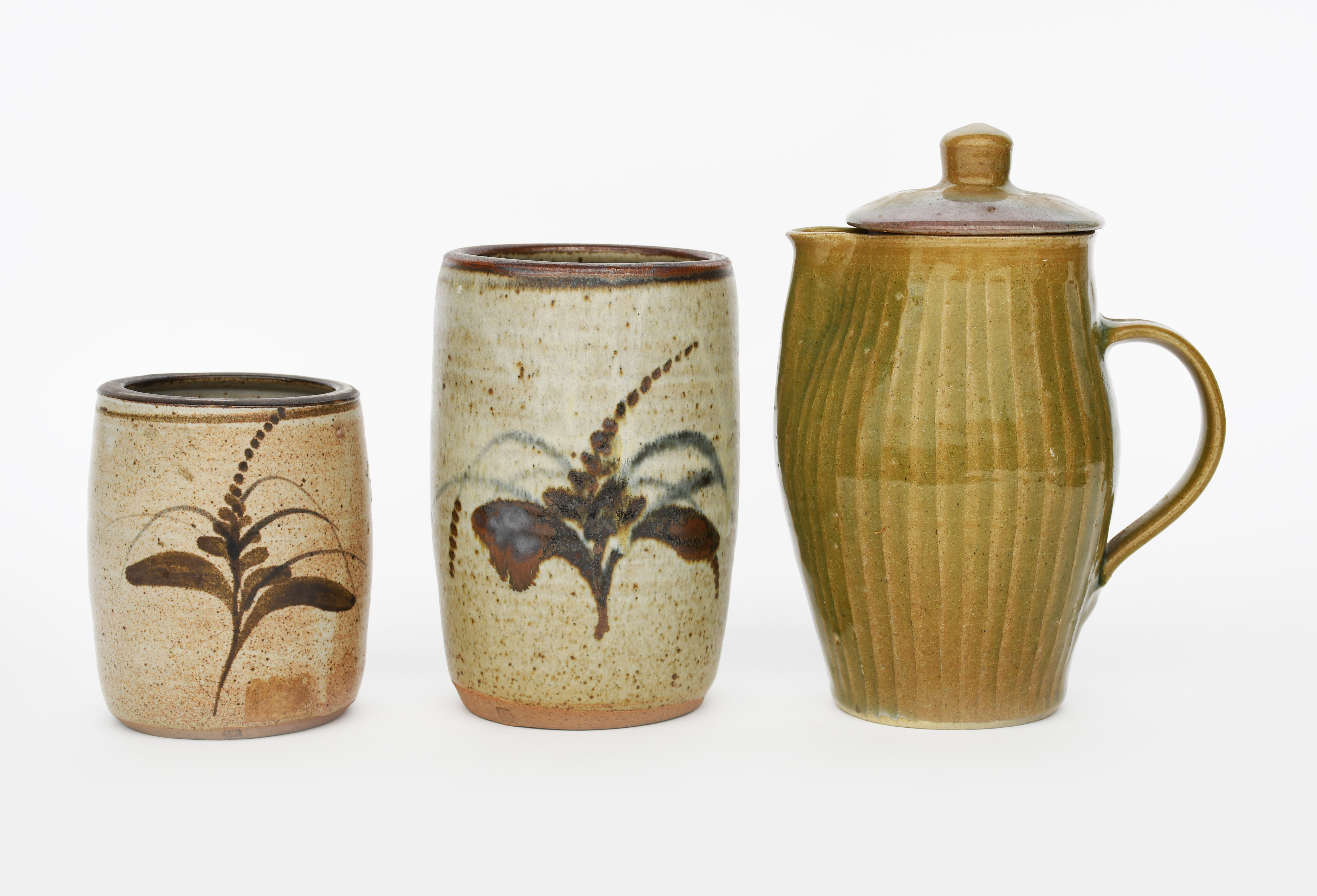 a Lowerdown Pottery stoneware vase, cylindrical form with inverted top rim, painted in tenmoku and blue with a simple fern frond, on an oatmeal ground, and another smaller, and a fluted coffee pot and cover covered in an ash green glaze by Jeremy Leach impressed Lowerdown marks to two vases, 18cm. high (Tallest vase), (3)