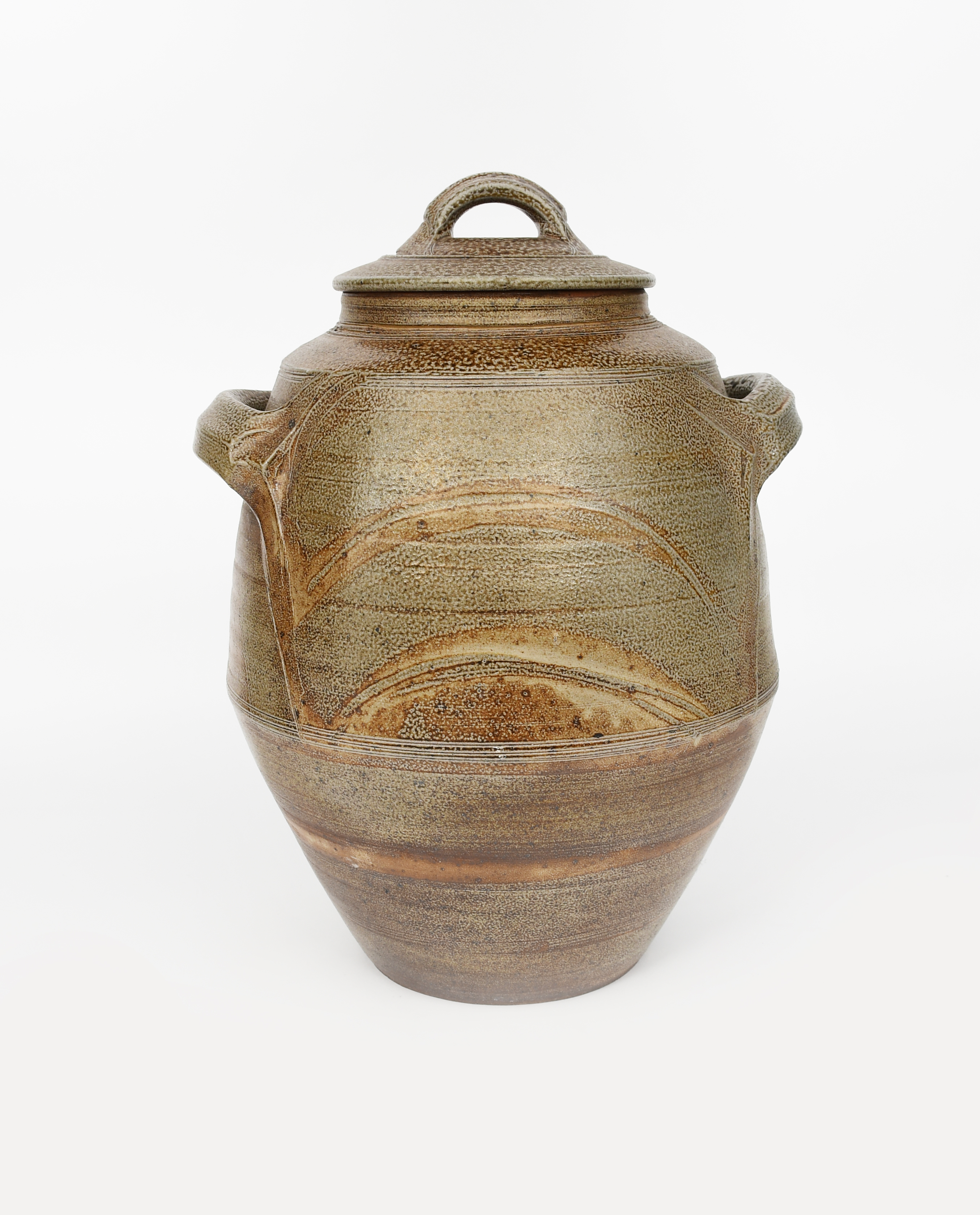 a large salt-glazed stoneware vase and cover, twin-handled form, lightly incised decoration. impressed seal mark, 54cm. high